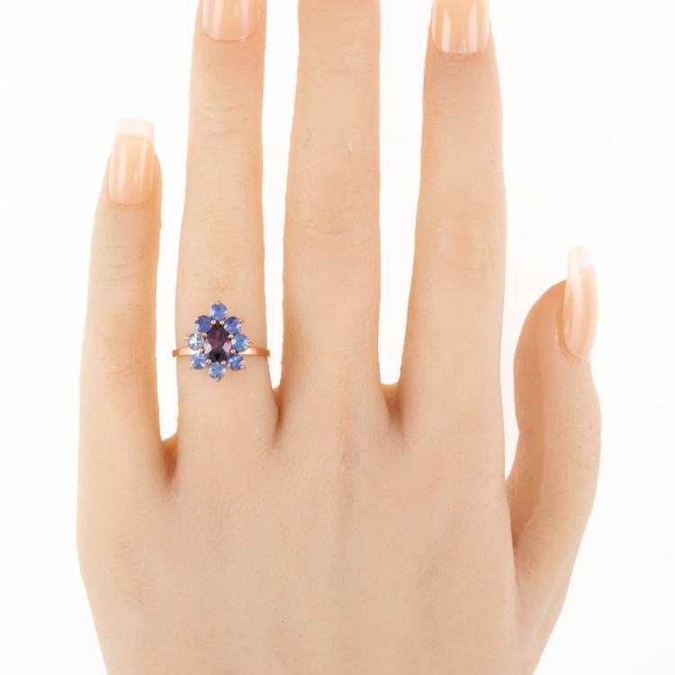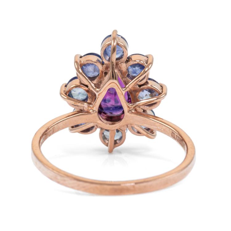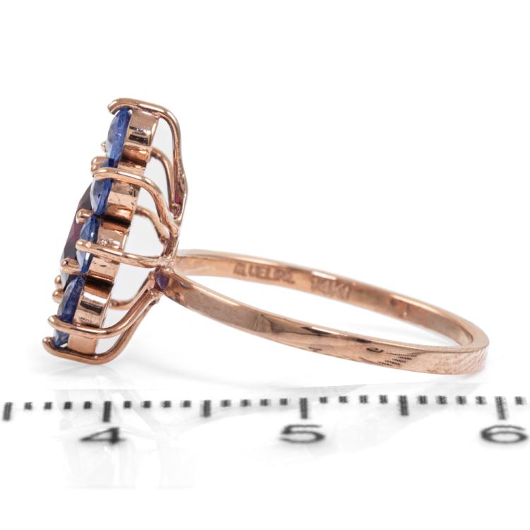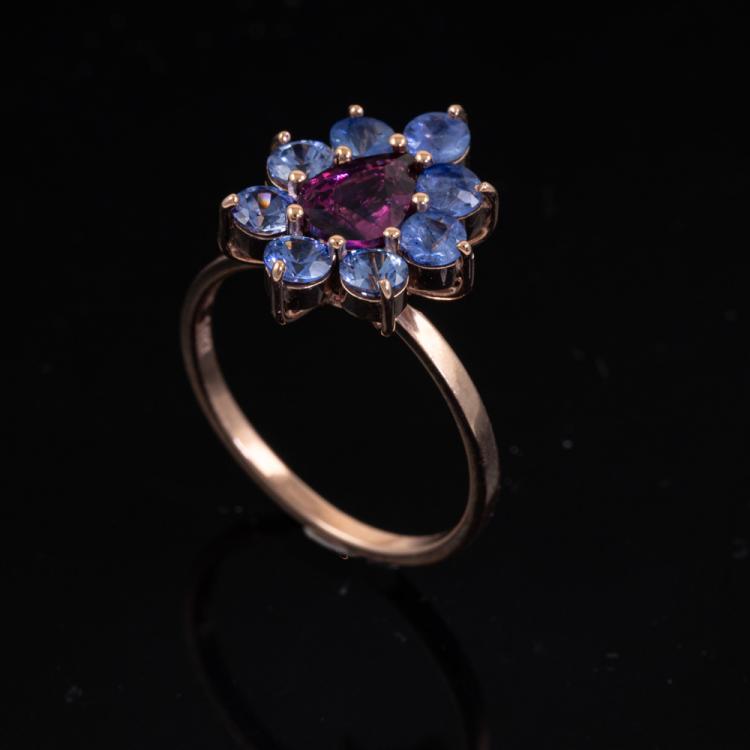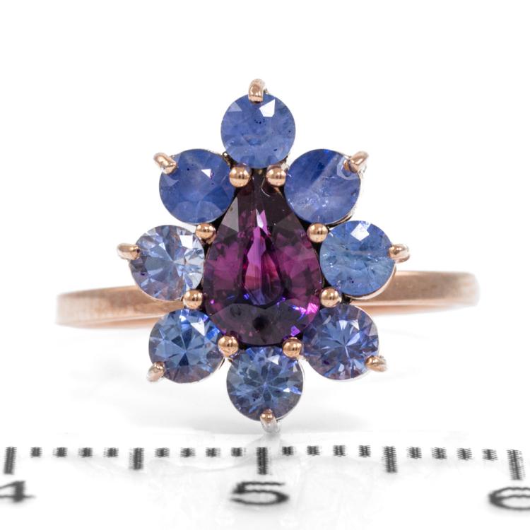 Ruby and Sapphire ring with a pear shape natural unheated Ceylon Ruby of 1.08ct and round unheated blue natural Sapphires totalling 1.85ct (Note, only one Sapphire of 0.23ct tested). 14ct rose gold. Ring size J. Band width: 1.4mm. Weight: 2.2g. With GGTL Report #209443. (As new)