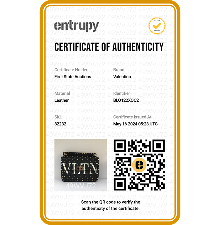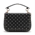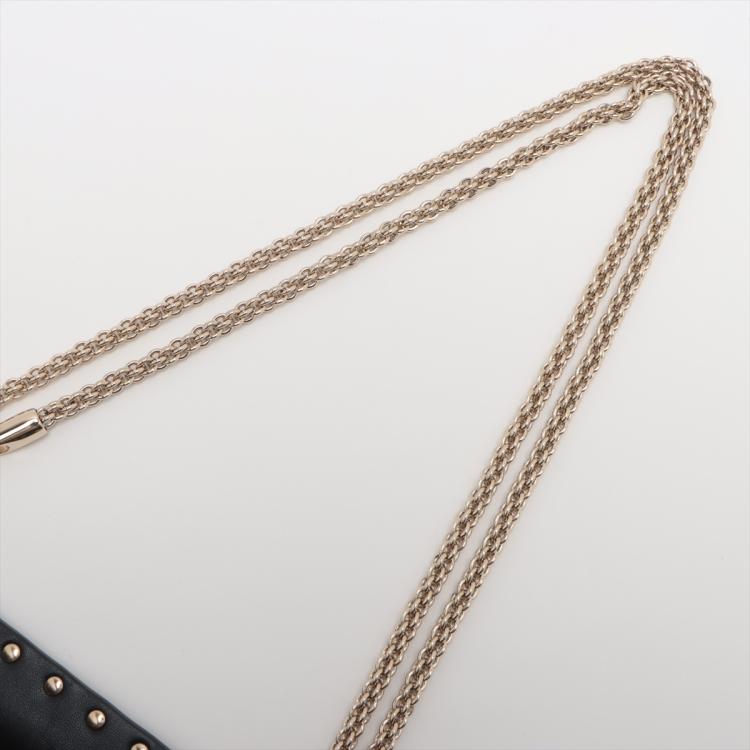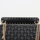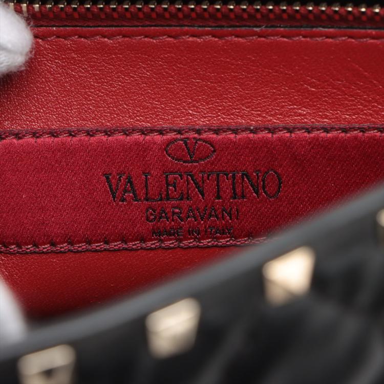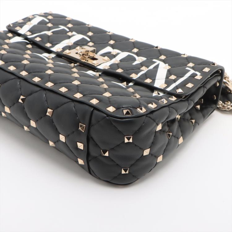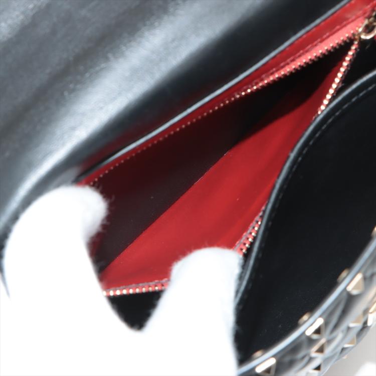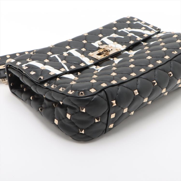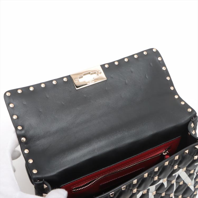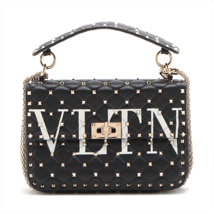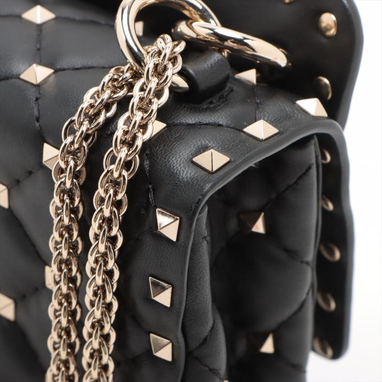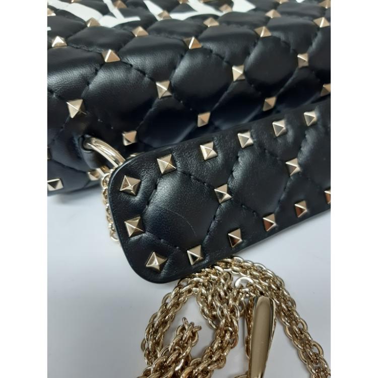 Valentino Garavani medium VLTN Rockstud Spike in black nappa lambskin. Featuring small studs embellished, a detachable handle, gold-toned hardware, VLTN printed at front. The flap with twist-lock closure opens to a red nappa leather lined interior with a zip pocket. Approximate dimensions: 23cm(L) x 16cm(H) x 6.5cm(D), 10cm handle drop and 57cm detachable chain drop. Accompanied by spare studs and a dust bag. With Entrupy Certificate of Authenticity. (Pre-owned)