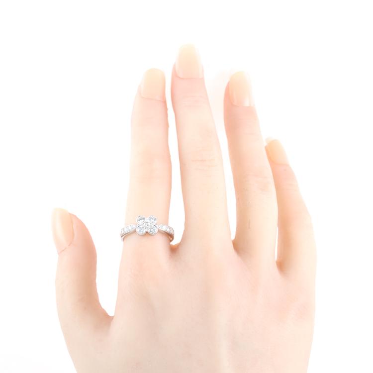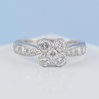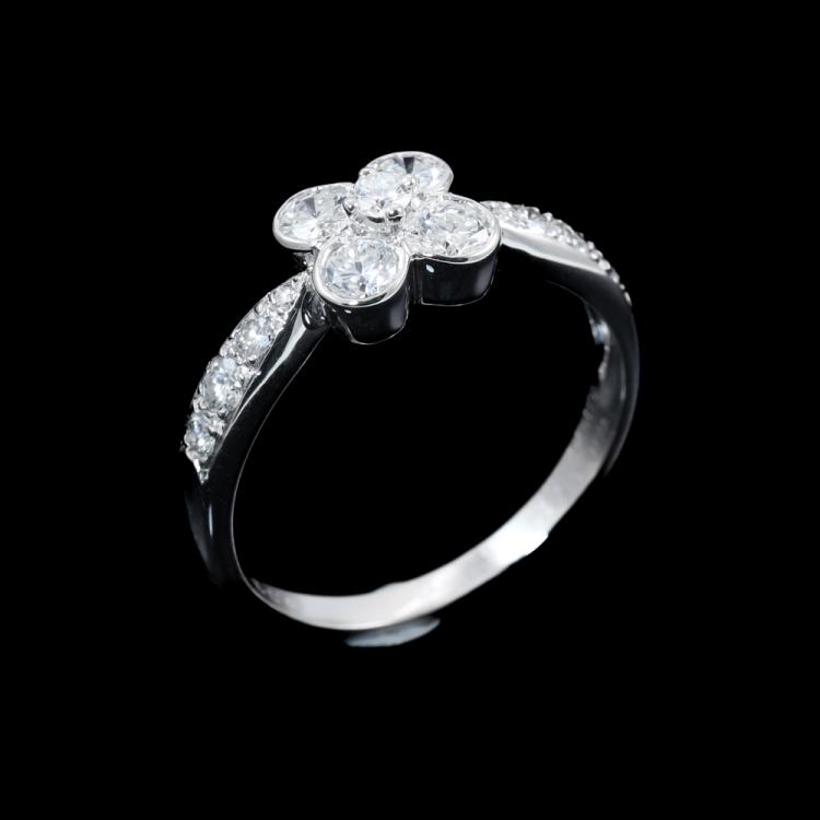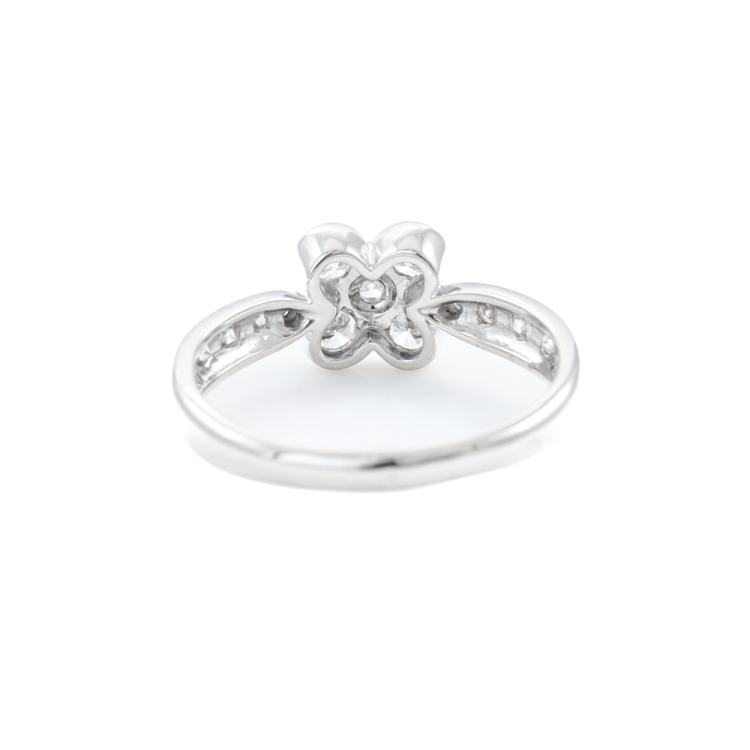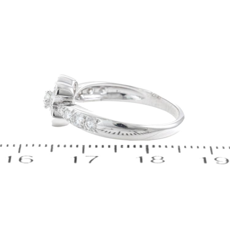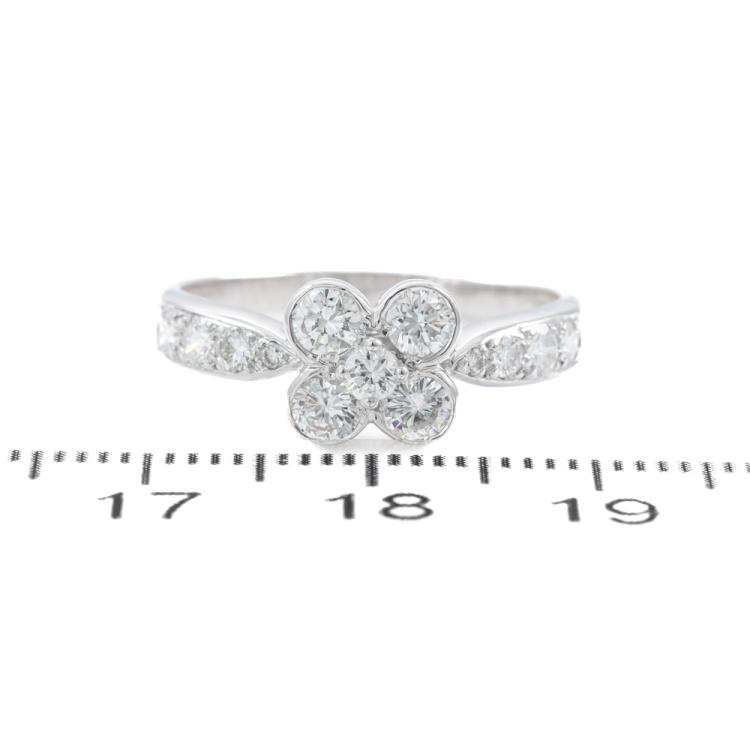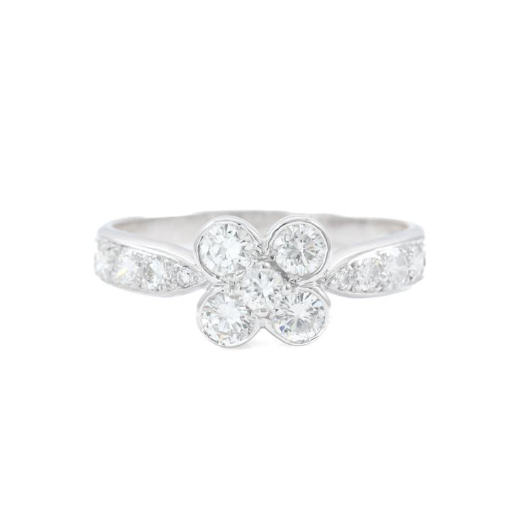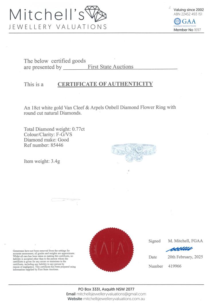 Van Cleef & Arpels Onbell Diamond Flower Ring with round Natural Diamonds totalling approximately 0.77ct (Estimated grading: F-G VS). 18ct white gold. Ring size O - ring resizing is not recommended. Band width: 2.1mm-3.2mm. Weight: 3.4g. With Certificate #419966. (Pre-owned)