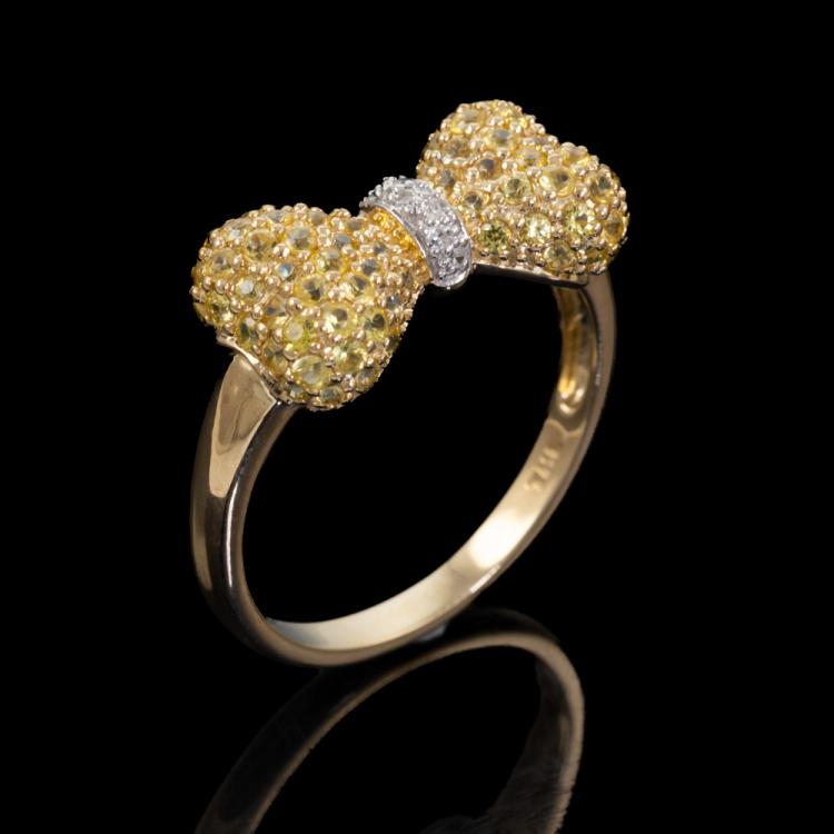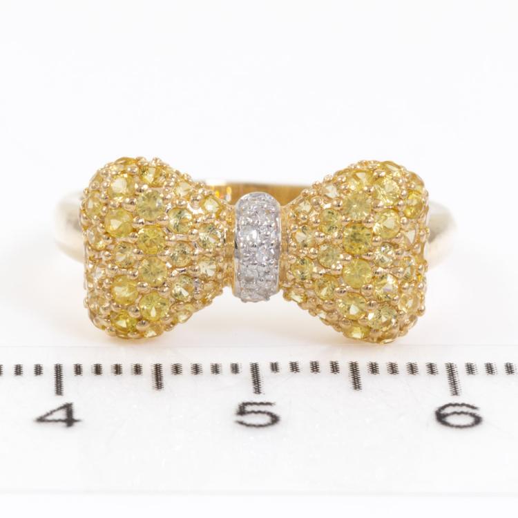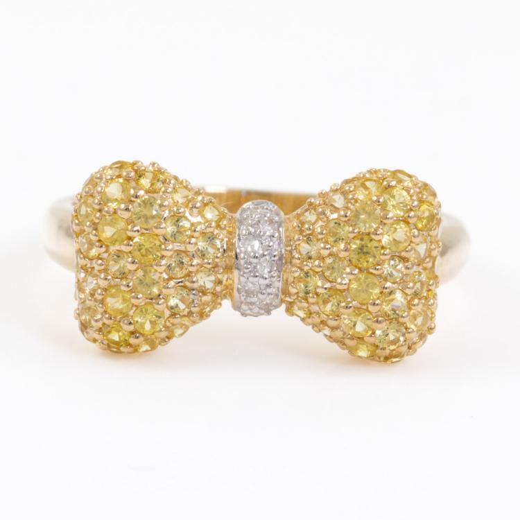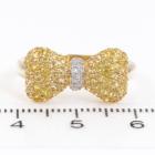 Diamond bow design ring with round white and yellow natural Diamonds totalling approximately 0.55cts (Estimated grading: Fancy Yellow & H SI). 9ct yellow and white gold. Ring size: P1/2. Band width: 2.2mm - 3.3mm. Weight: 3.0g (Pre-Owned) ^