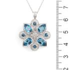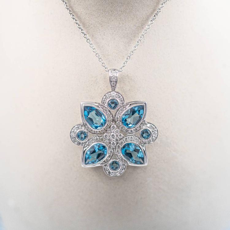 Topaz and Diamond pendant with round & pear shape blue Natural Topaz totalling 4.31cts and round Natural Diamonds totalling 0.71cts (Estimated grading: G-H VS-SI). 18ct white gold with 14ct white gold 40cm chain. Weight: 7.3g. (Pre-owned)