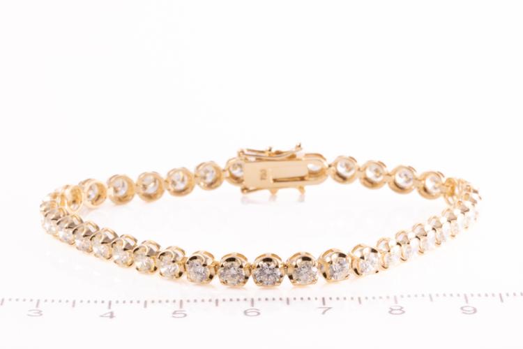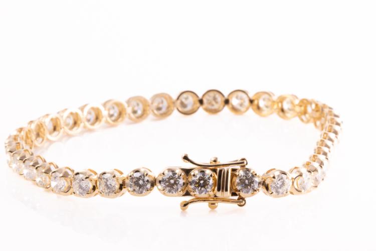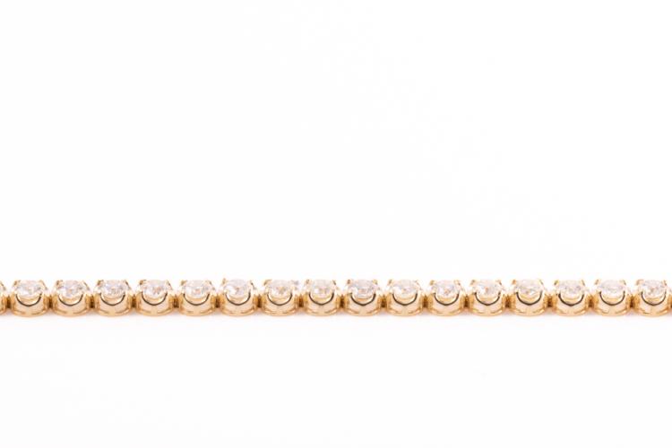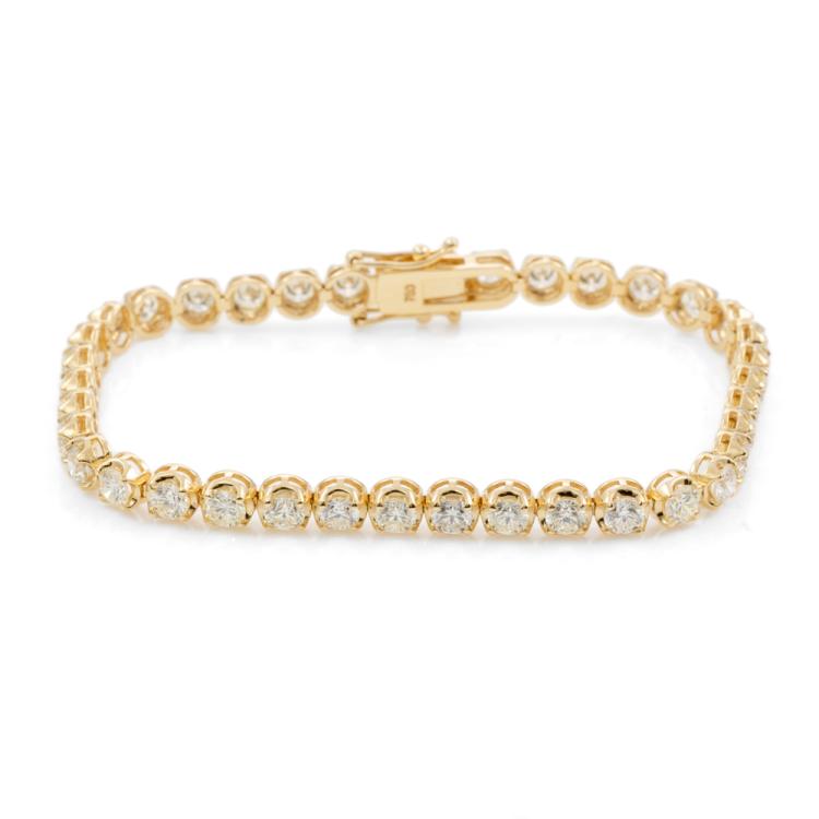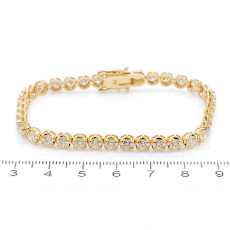 Diamond tennis bracelet with 37 round brilliant cut Natural Diamonds totalling 6.57ct (Estimated grading: I-J SI). 18ct yellow gold. Length: 18cm. Weight: 12.6g. With Certificate #417262. (New)