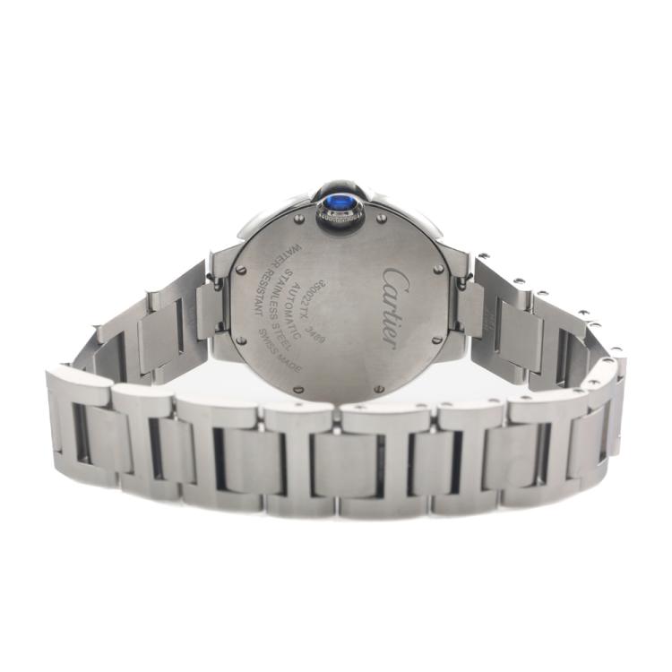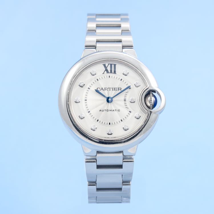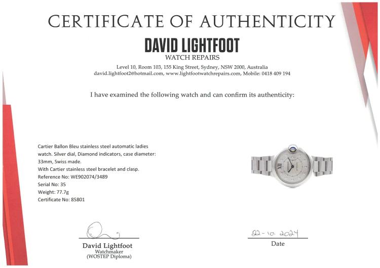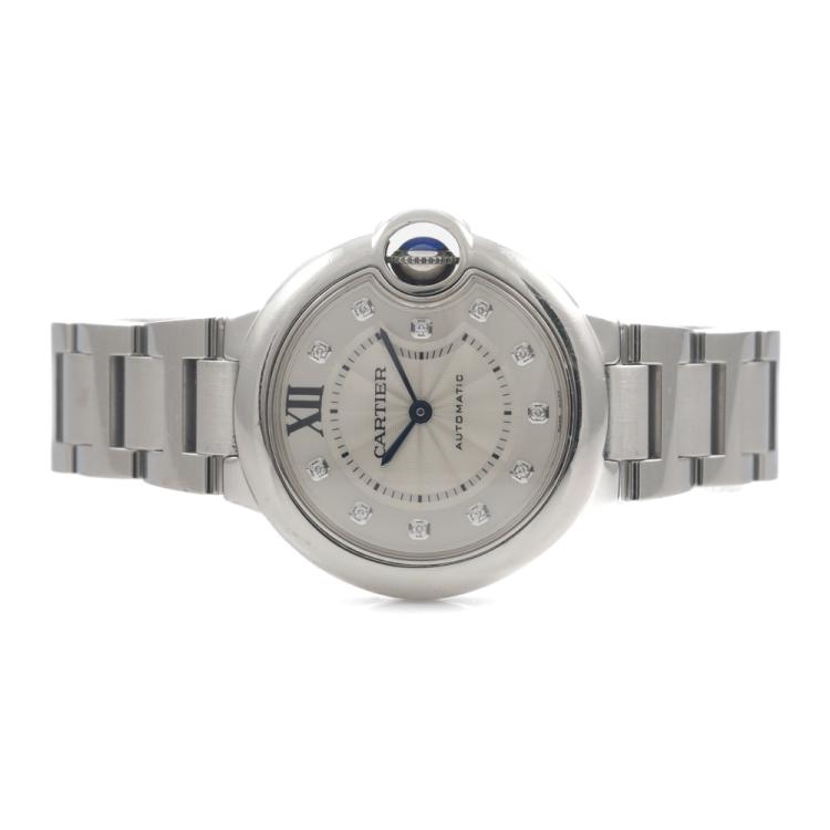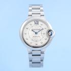 Cartier Ballon Bleu stainless steel automatic ladies watch. Silver dial, Diamond indicators, case diameter: 33mm, wrist size: 17cm, Swiss made. Ref# WE902074/3489. With Cartier stainless steel bracelet and clasp. With Certificate of Authenticity and Cartier box. 3 month FSA warranty. (Pre-owned)