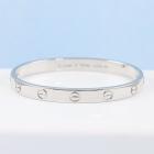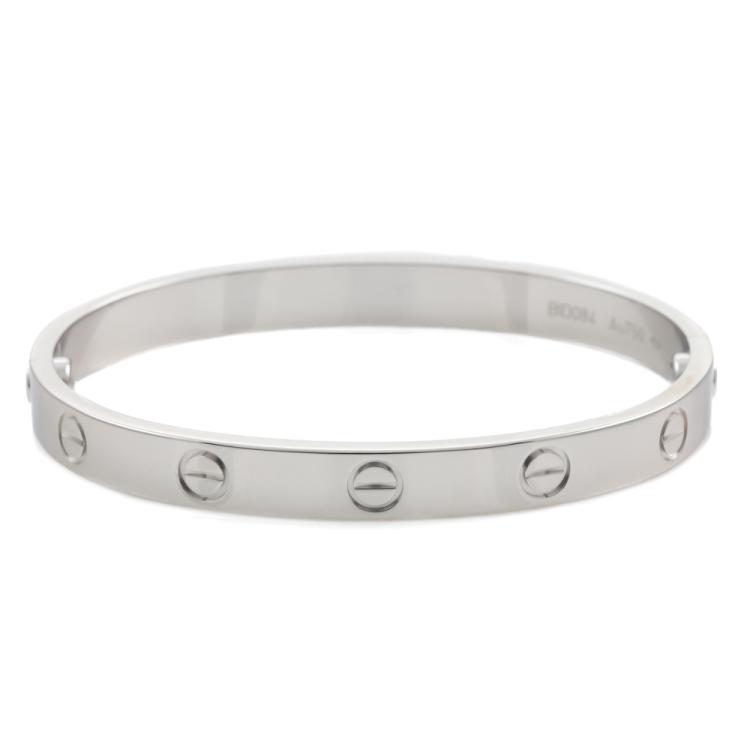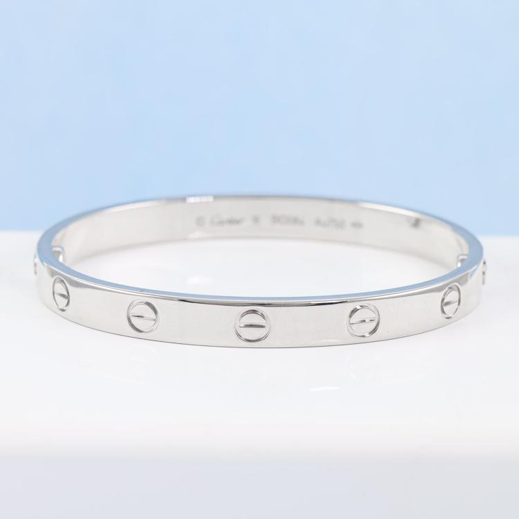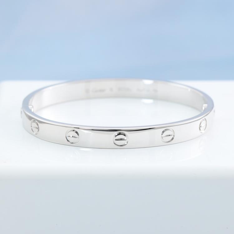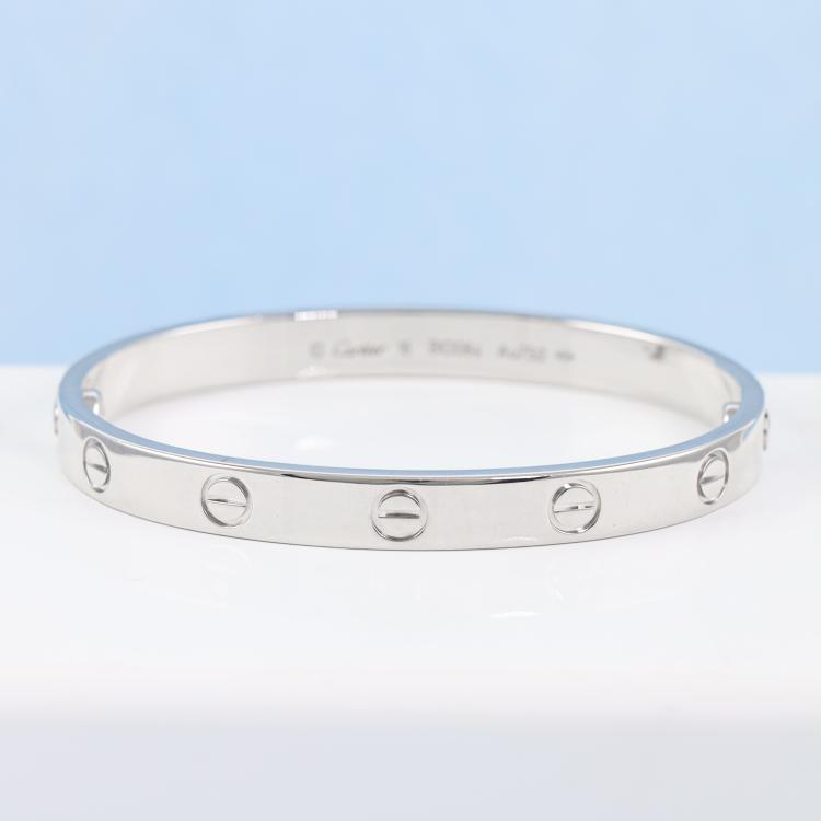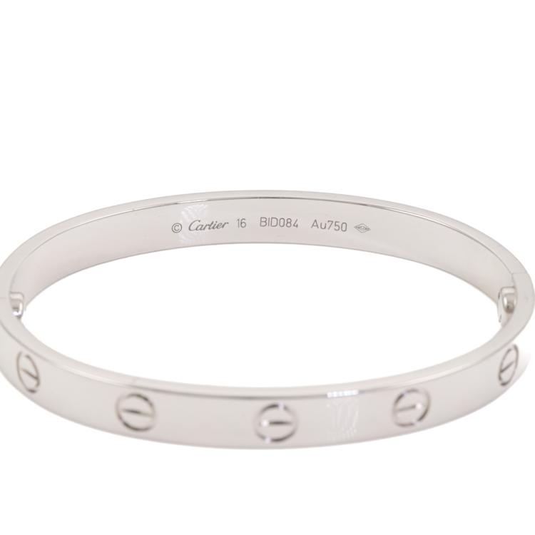 Cartier Love bracelet in 18ct white gold. Width: 6.1mm. Cartier stamped size 16cm. Weight: 32.0g. With Cartier screwdriver and Instruction Booklet inside Cartier box. With Certificate #419146. (Pre-owned)