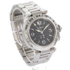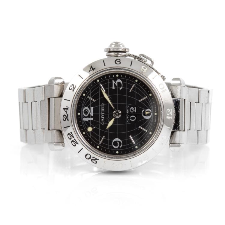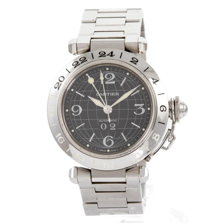 Cartier Pasha C GMT stainless steel automatic watch. Black dial, date, case diameter: 35mm, wrist size: 17cm, Swiss made. Ref# W31049M7. With Cartier stainless steel bracelet and clasp. With Certificate of Authenticity and Cartier box. 3 months FSA warranty (Pre-owned)