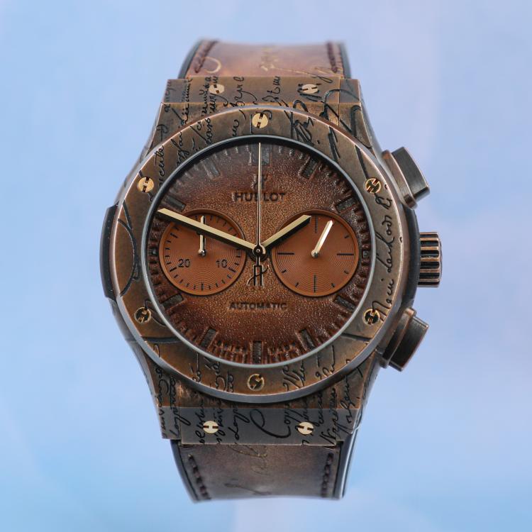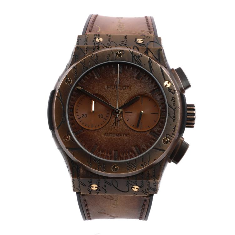 Hublot Classic Fusion Berluti Limited Edition of 200 bronze automatic mens watch. Brown chronograph dial, case diameter: 45mm, adjustable max wrist size: 18cm, Swiss made. Ref# 521.BZ.051G.VR.BER19. With Hublot brown leather & black rubber strap and clasp. With Certificate of Authenticity, Hublot cleaning kit, Hublot travel case and box. 3 month FSA warranty. (Pre-owned)