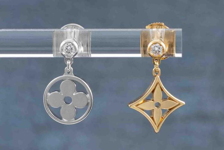 Louis Vuitton Idylle Blossom Diamond stud earrings with round natural Diamonds totalling 0.08ct. One earrings with 18ct yellow gold and the other with 18ct white gold. Made in Italy. Weight: 3.0g. With Louis Vuitton box. (Pre-owned)