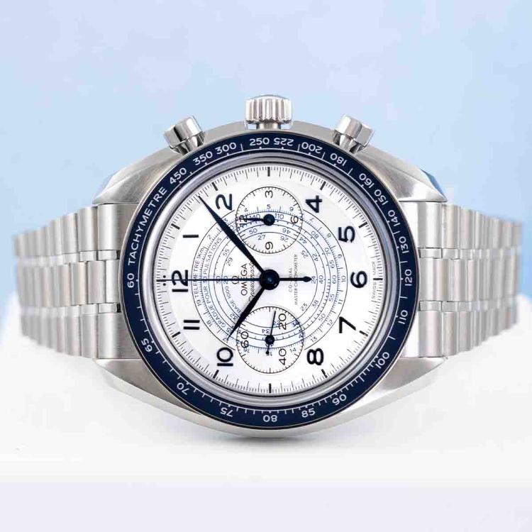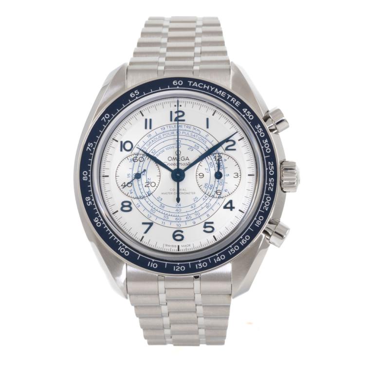 Omega Speedmaster Chronoscope stainless steel manual winding mens watch. Silver chronograph dial, case diameter: 43mm, wrist size: 20cm, Swiss made. Ref# 329.30.43.51.02.001. With Omega stainless steel bracelet and clasp. With Unstamped Omega International Warranty card, Omega pictograms card, Omega Mater Chronometer card and Omega box. 3 month FSA warranty (As new, Note: minor scuff on case and bracelet due to being display stock)