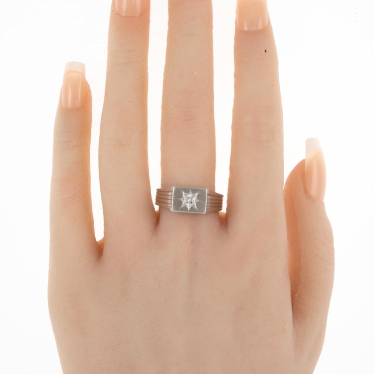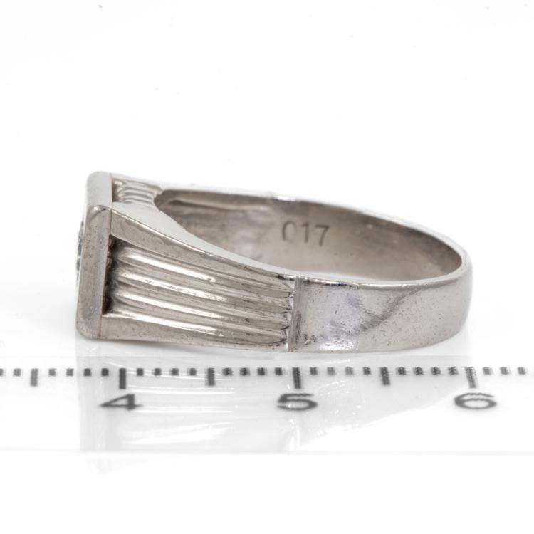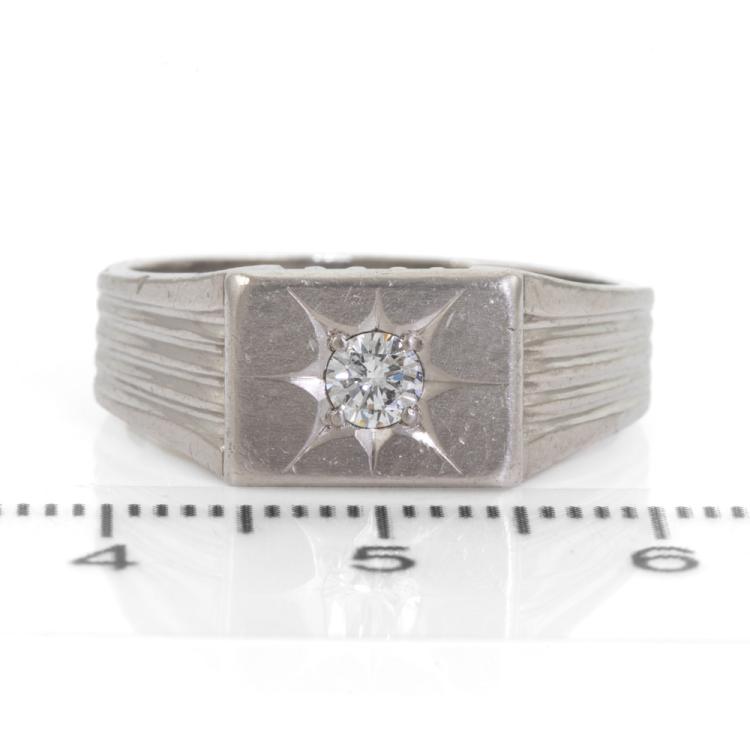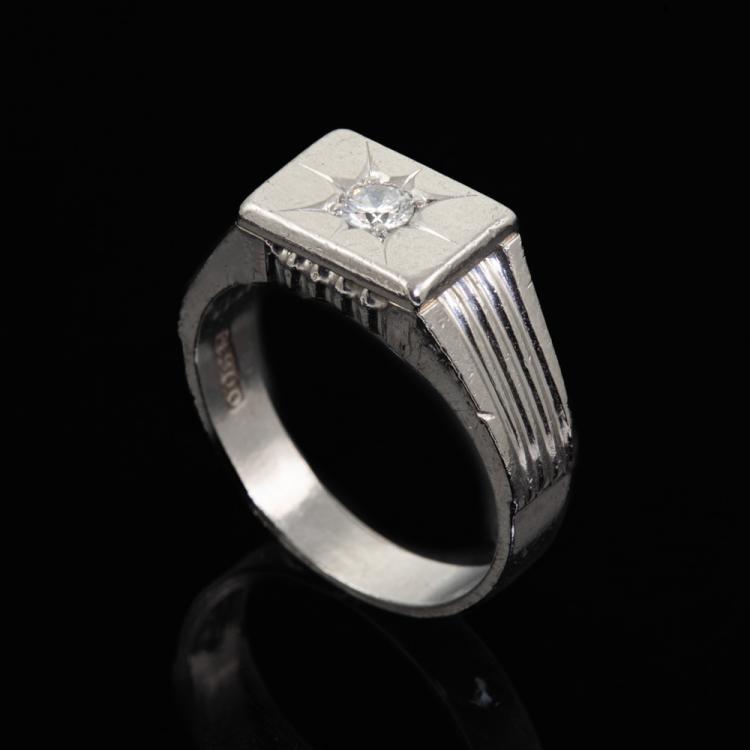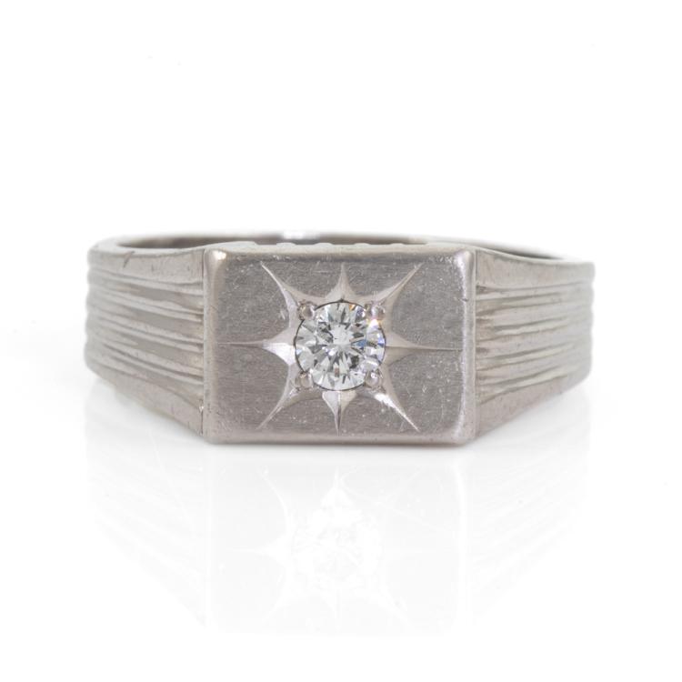 Mens ring with a round Natural Diamond of 0.17ct. Platinum 900. Ring size Q. Band width: 3.8mm-4.9mm. Weight: 9.9g. (Pre-owned)