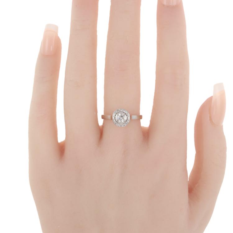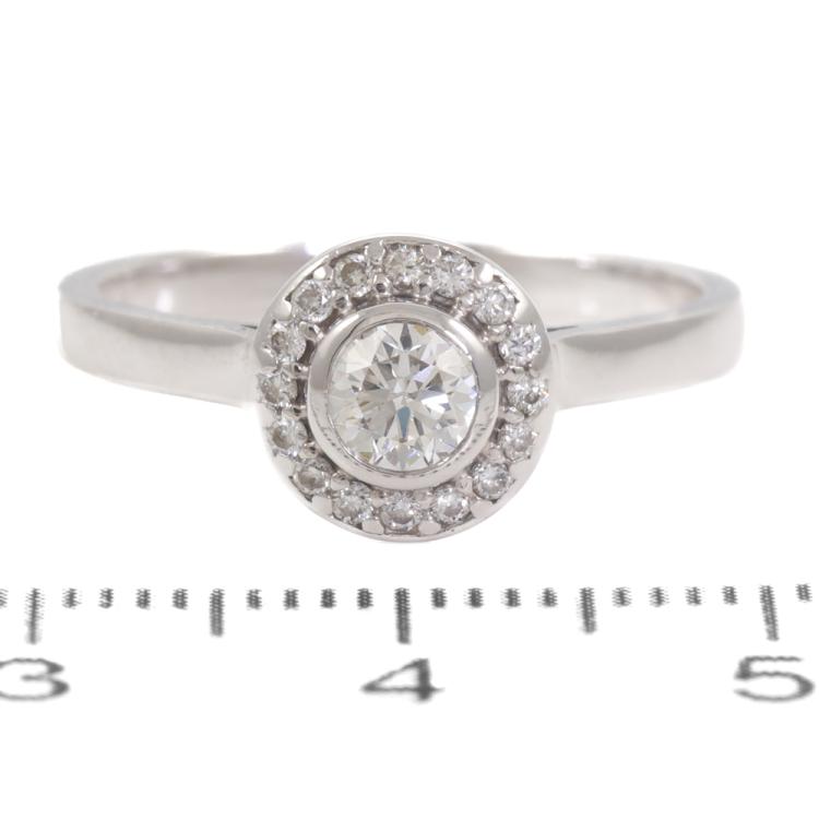 Diamond halo ring with a centre round Natural Diamond of approximately 0.30ct (Estimated grading: H-I SI) and surrounding Natural Diamonds totalling approximately 0.08ct. 18ct white gold. Ring size M1/2. Band width: 2.2mm. Weight: 3.2g. (Pre-owned)