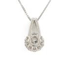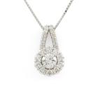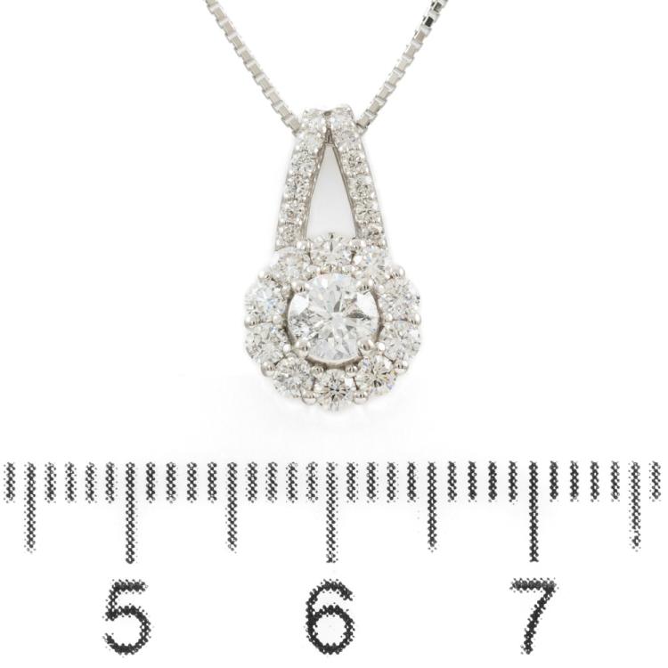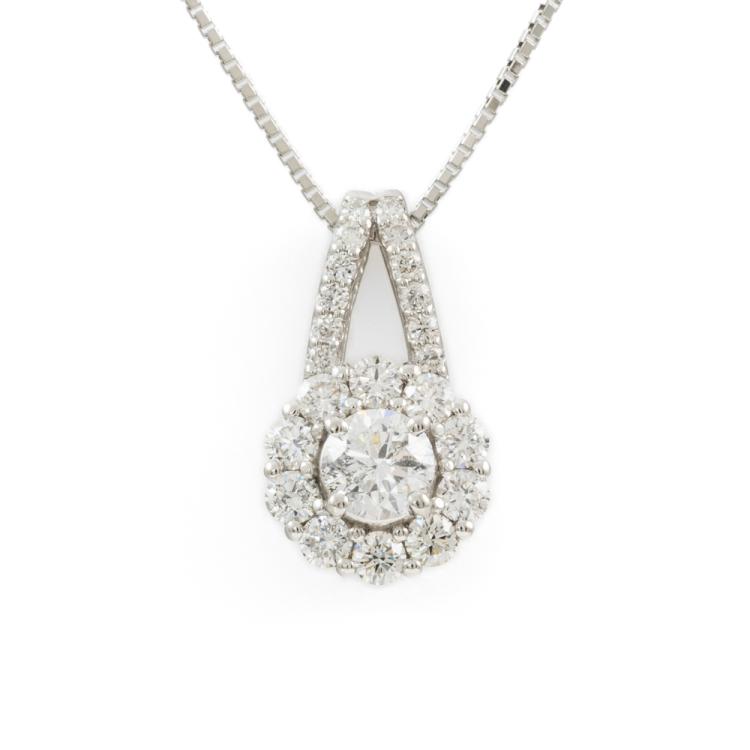 Diamond halo pendant with centre round natural Diamond of 0.31ct (Estimated grading F-G P1) and the rest round natural Diamonds totalling 0.43ct (Estimated grading: H-I SI). Platinum-900 with 45cm 18ct white gold adjustable chain. Weight: 4.2g. (Pre-owned)
