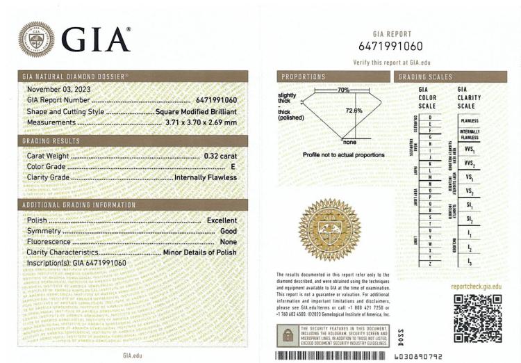 A loose princess cut Natural Diamond of 0.32ct (with GIA summary report graded as E Internally Flawless# 6471991060). (New)