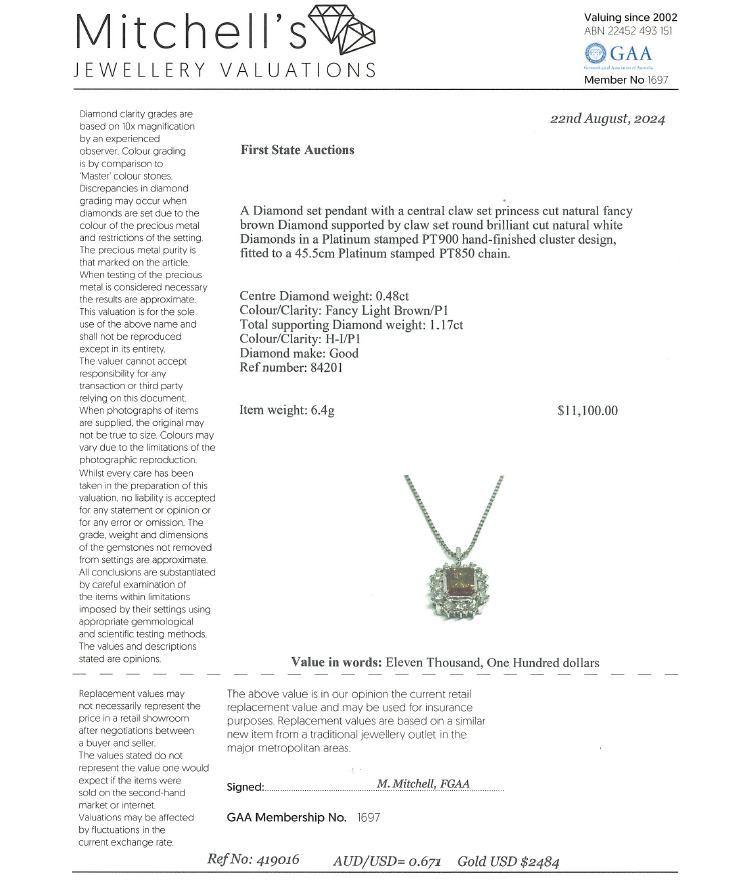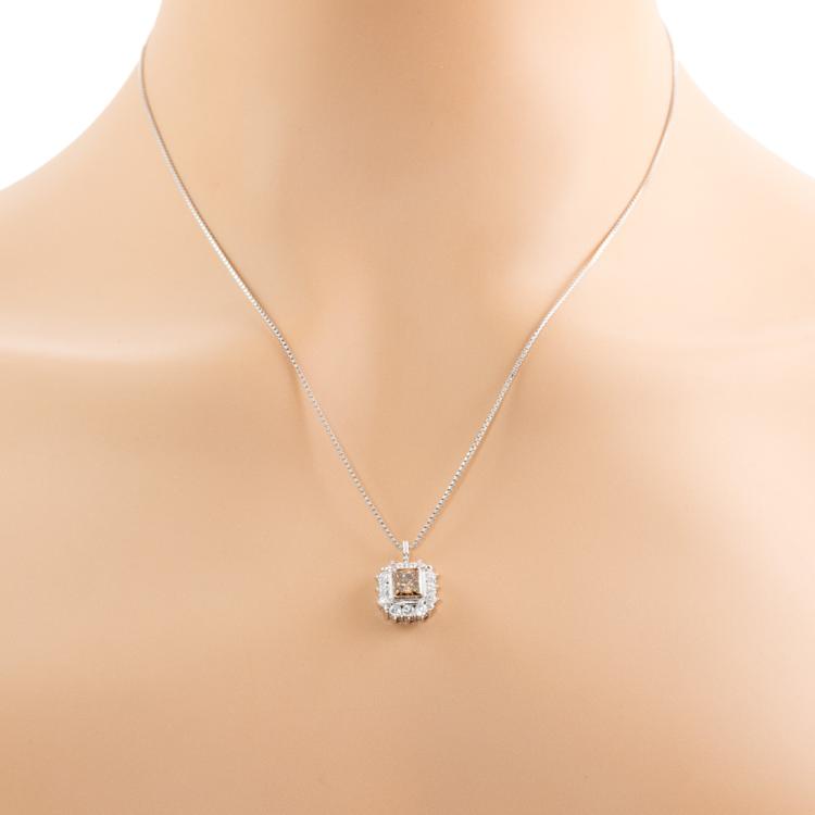 Diamond dress pendant with centre rectangular princess cut natural Champagne Diamond totalling of 0.48ct (Estimated grading: Deep Champagne P1), round Natural Diamonds totalling 1.17ct (estimated grading: H-I P1). Platinum-900 with Platinum 850 adjustable 45cm chain. Weight: 6.4g. With Valuation Certificate #419016. (Pre-owned)