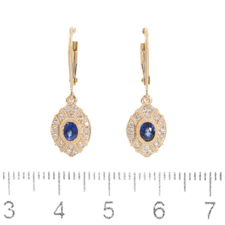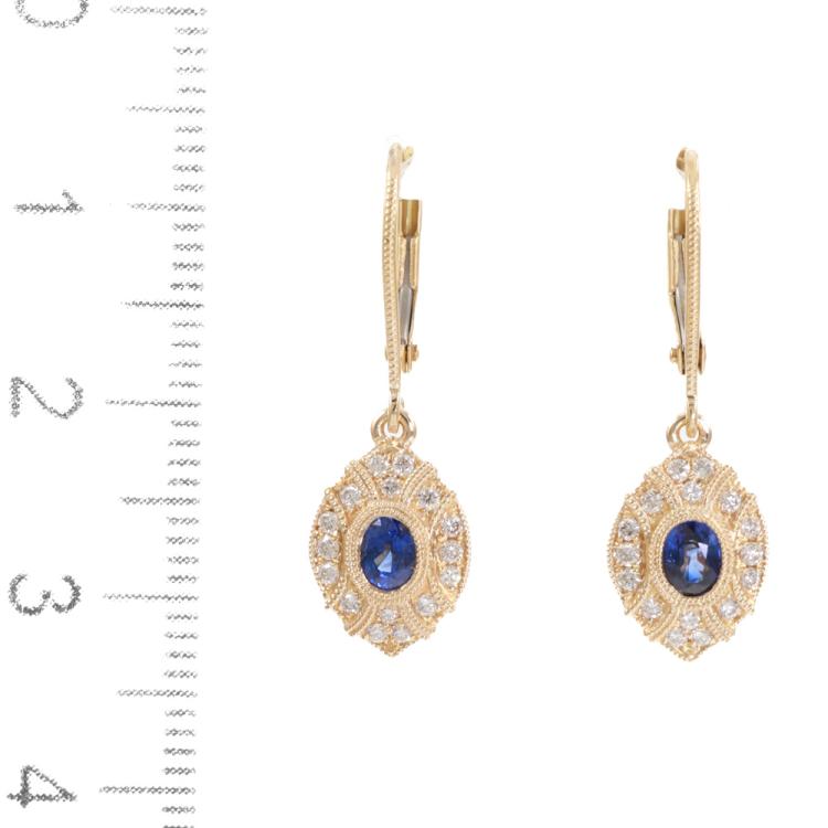Sapphire and Diamond leverback earrings with oval shape Natural blue Sapphire totalling 0.49ct and round Natural Diamonds totalling 0.21ct. 18ct yellow gold. Weight: 3.2g. (New)
