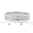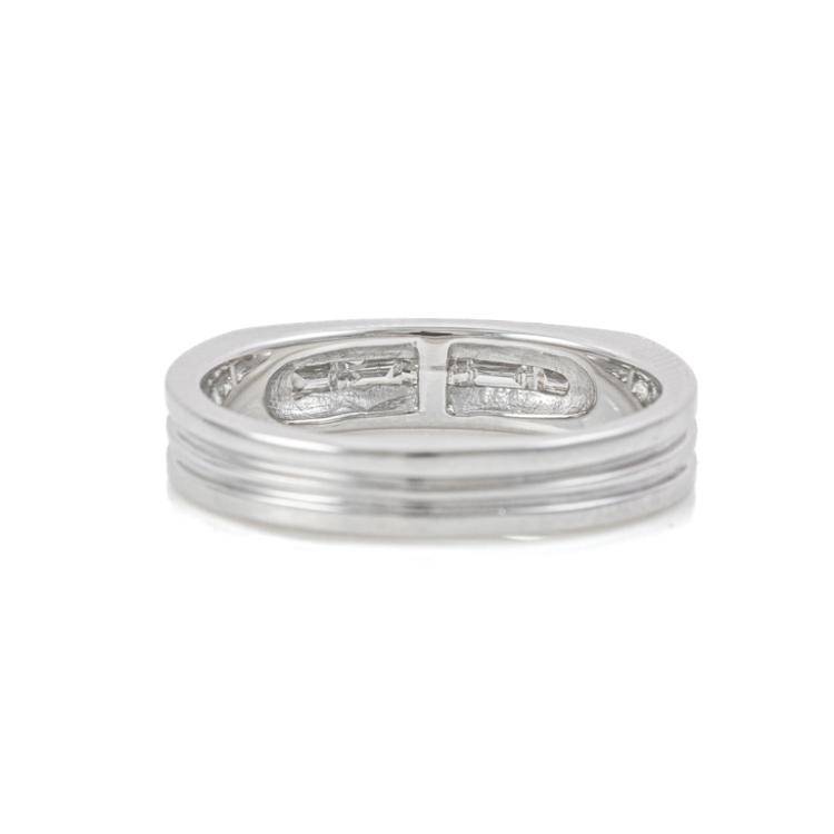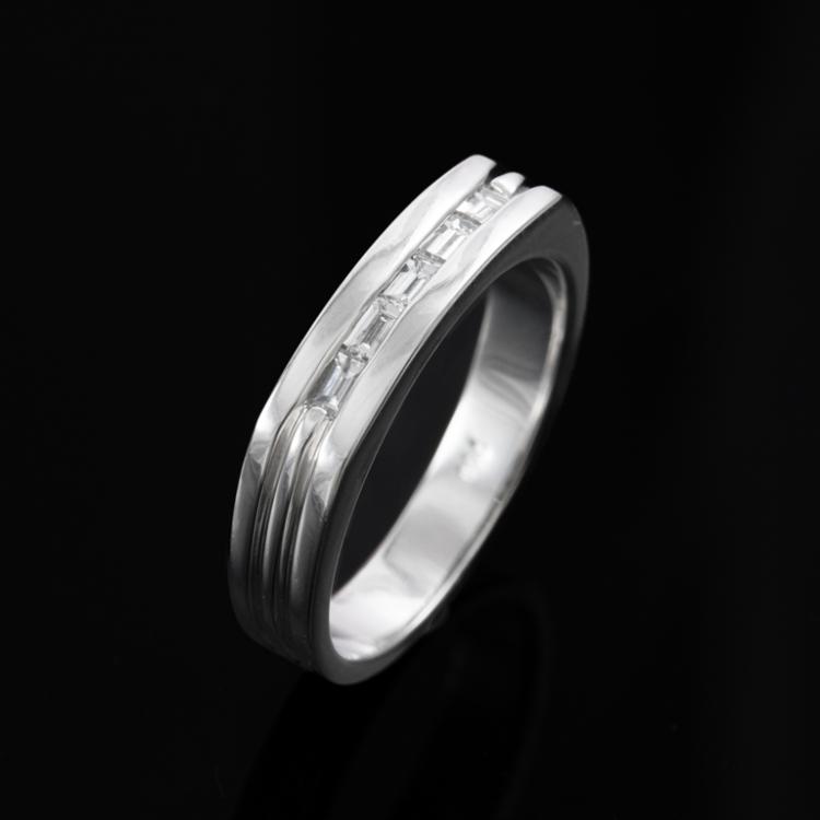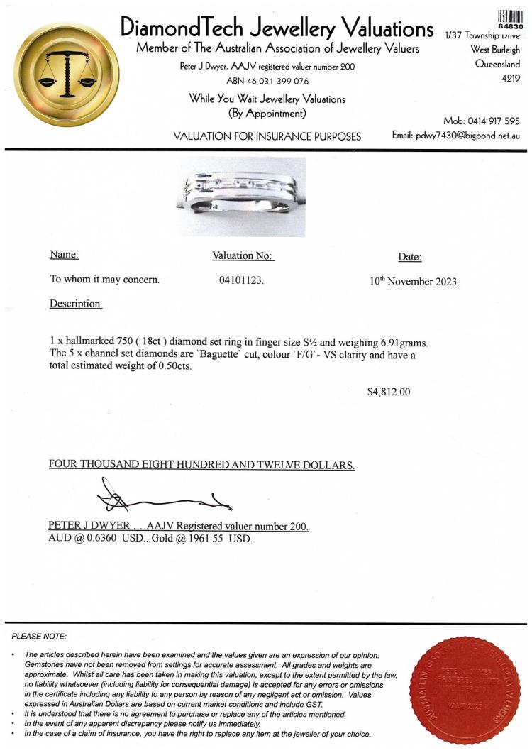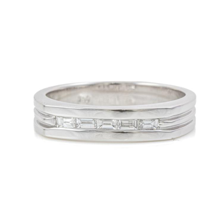 Mens band ring with 5 baguette cut Natural Diamonds totalling 0.50cts (Estimated grading: F-G VS). 18ct white gold. Ring size S- ring resizing is not recommended. Band width: 4mm - 4.7mm. Weight: 6.9g. With Valuation Certificate #04101123