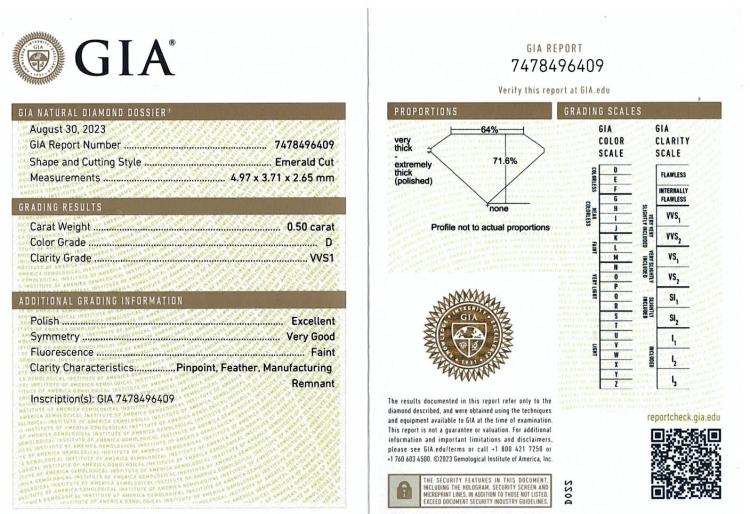 A loose emerald cut Natural Diamond of 0.50ct (with GIA Summary Report graded as D VVS1#7478496409