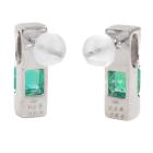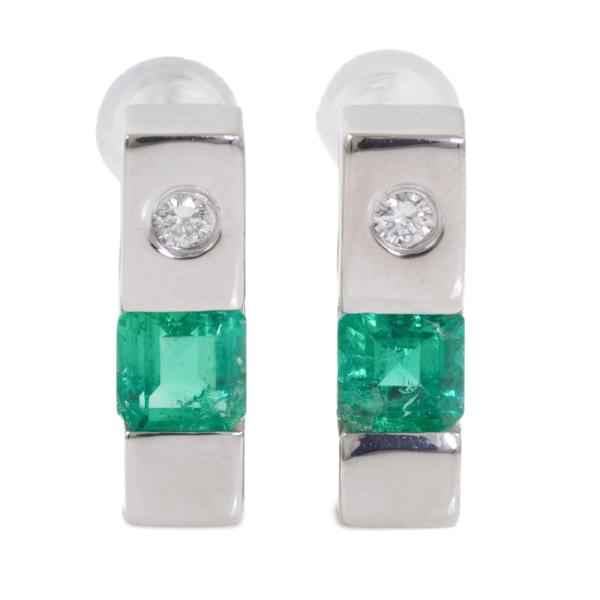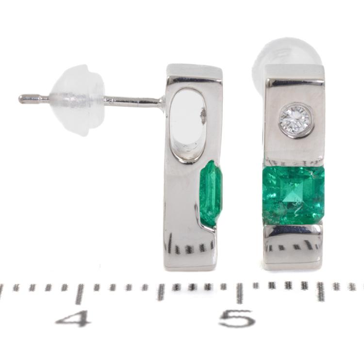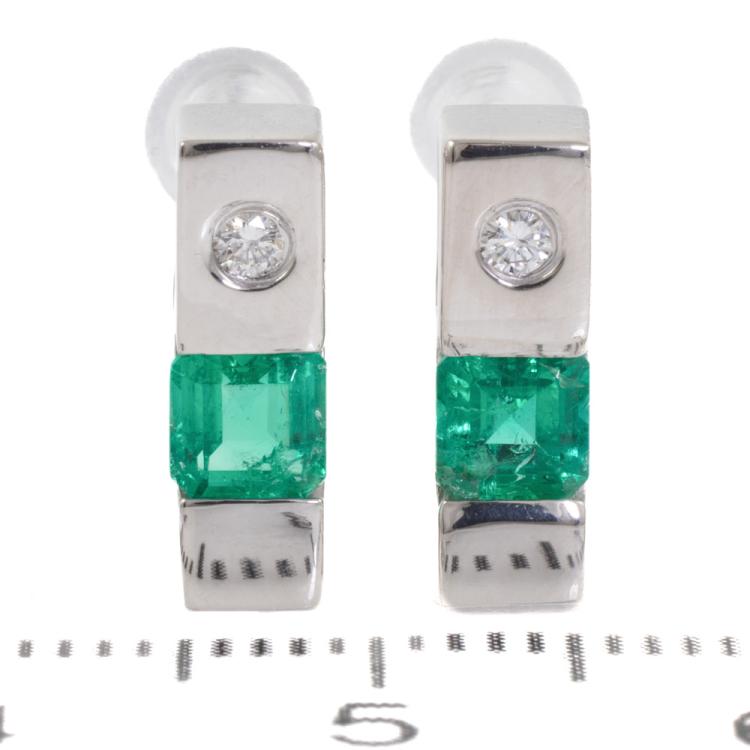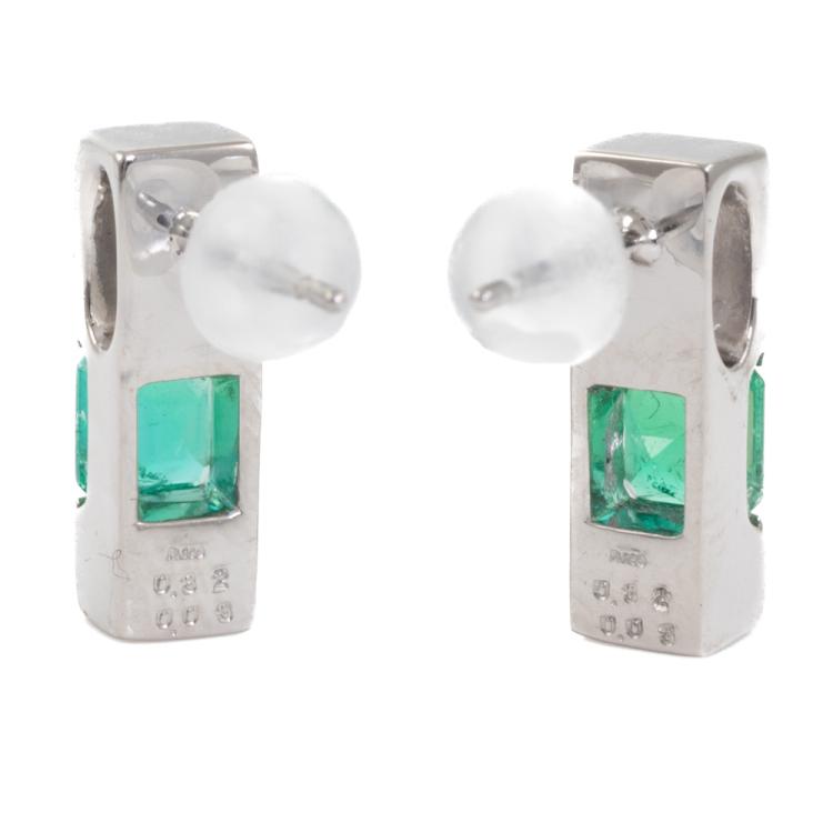 Emerald and Diamond earrings with emerald cut Natural Emeralds totalling 0.64ct and 2 round Natural Diamonds totalling 0.06ct. Platinum - 900 with silicon backs. Weight: 4.7g (Pre-owned)