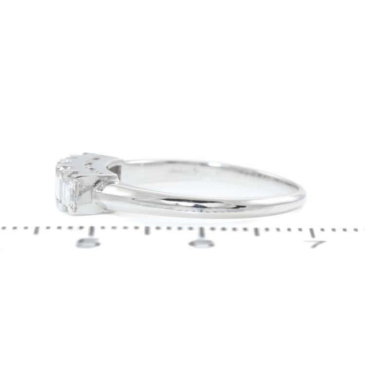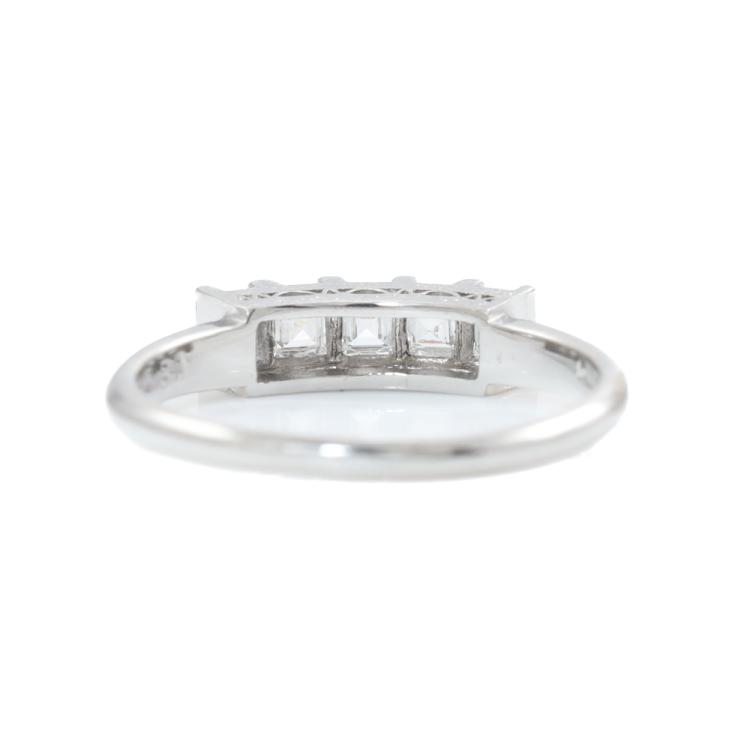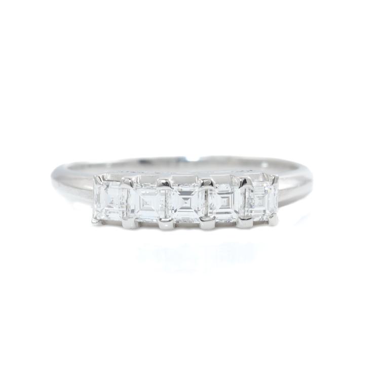 Diamond eternity ring with carre cut Natural Diamonds totalling 0.68ct (Estimated grading: G VS). Platinum - 900. Ring size: O 1/2. Band width: 1.7mm - 2.5mm. Weight: 4.0g. (Pre-owned)