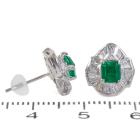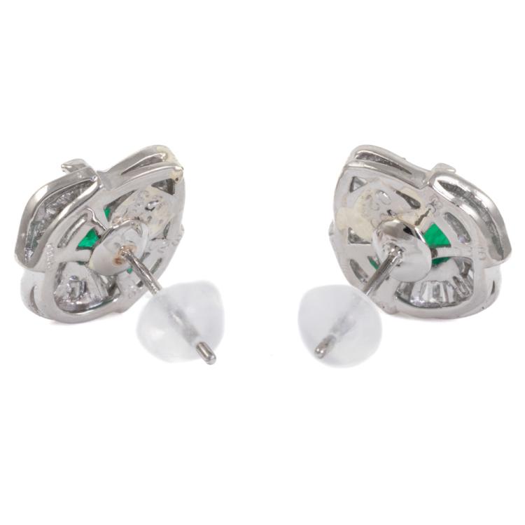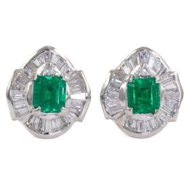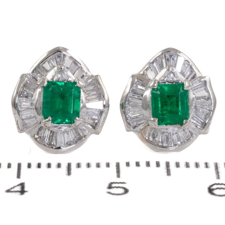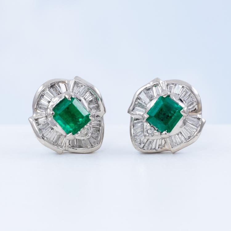 Emerald and Diamond earrings with square emerald cut Natural Emeralds totalling 0.70ct and baguette cut & round Natural Diamonds totalling 0.46ct (Estimated grading: G-H SI-P1). Platinum-900 with silicon backs. Weight: 3.4g. (Pre-owned)