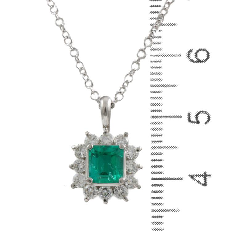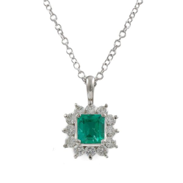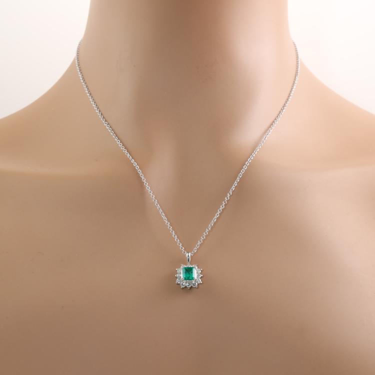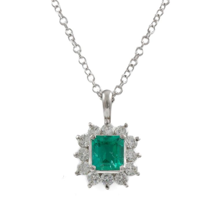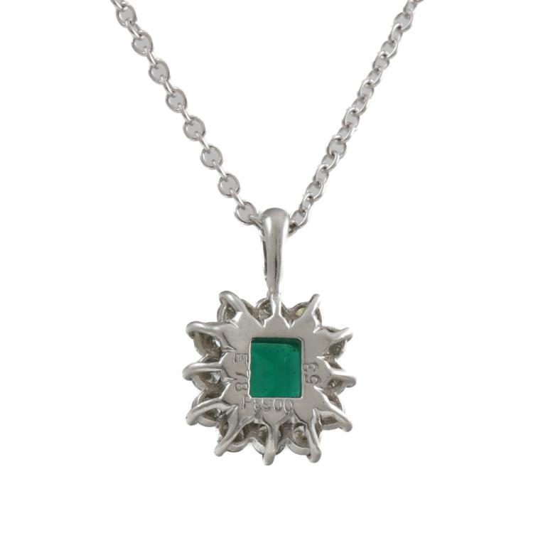 Emerald and Diamond pendant with emerald cut Natural Emerald of 0.78ct and round Natural Diamonds totalling 0.53ct (Estimated grading: G-H SI). Platinum - 900 with 45cm 18ct white gold chain. Weight: 5.3g. (Pre-owned)