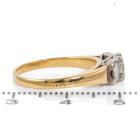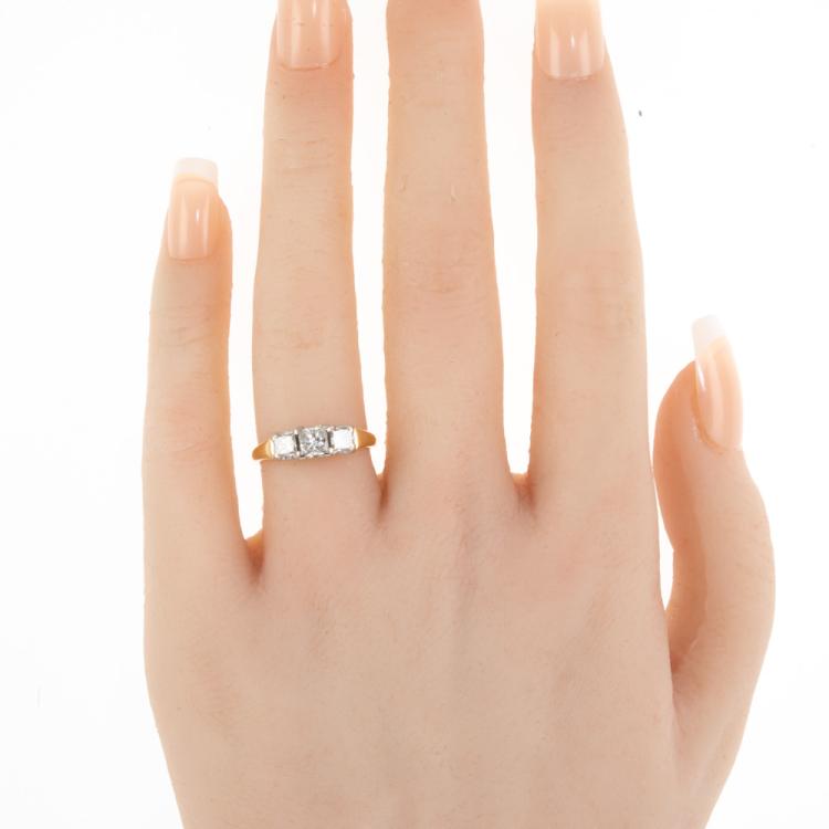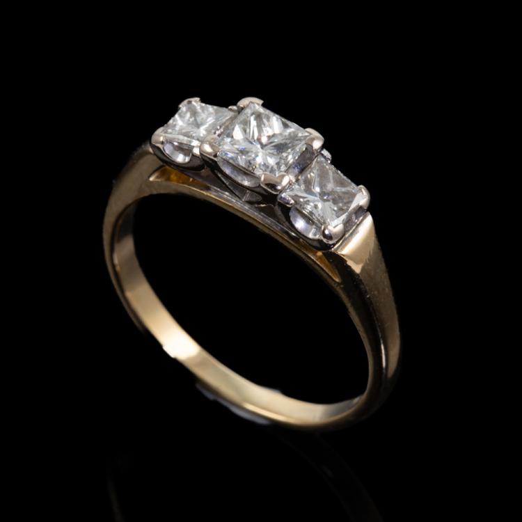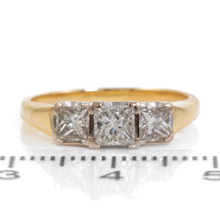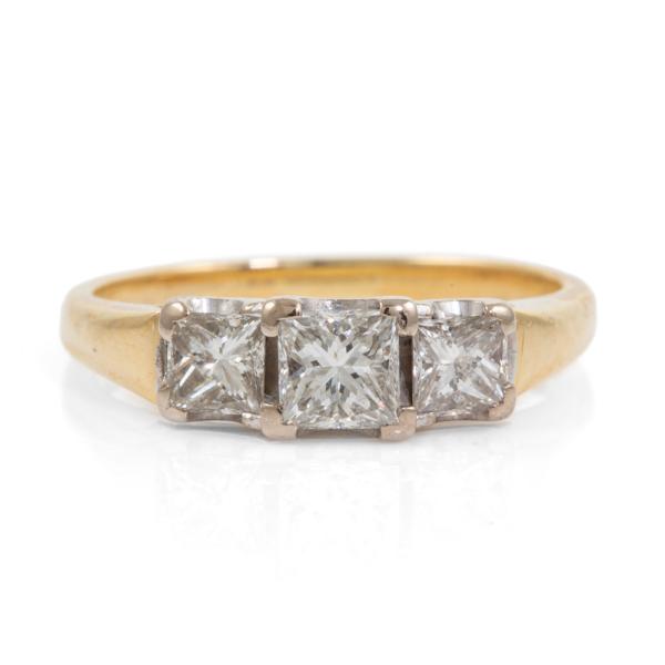 Diamond trilogy ring with 3 princess cut Natural Diamonds totalling approximately 0.79ct (Estimated grading: H-I SI). 18ct yellow & white gold. Ring size J1/2. Band width: 1.7mm-2.6mm. Weight: 3.6g. (Pre-owned)
