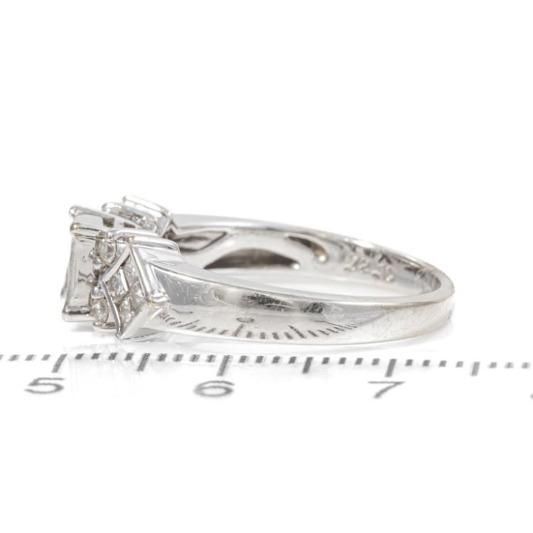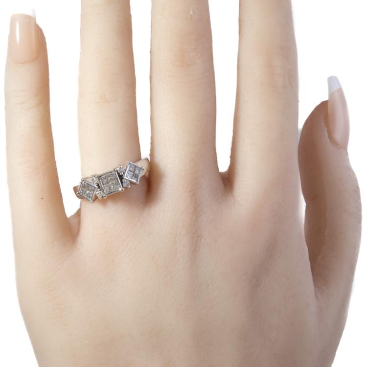 Diamond dress ring with round & princess cut invisible set natural Diamonds totalling 0.82ct (Estimated grading: I-J SI). 18ct white gold. Ring size O - ring resizing is not recommended. Band width: 2.3mm-4.1mm. Weight: 5.2g. (Pre-owned)