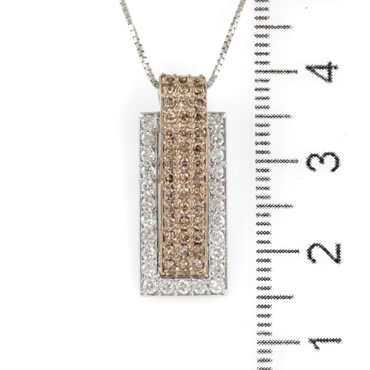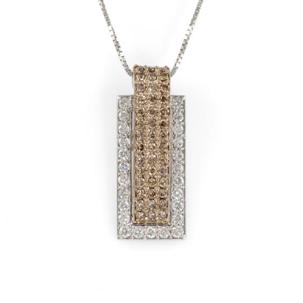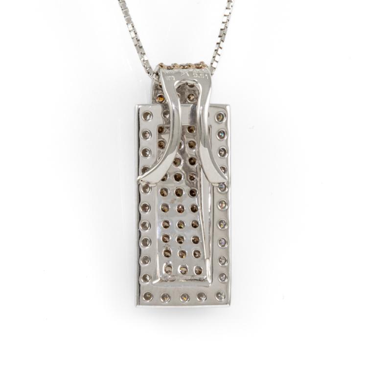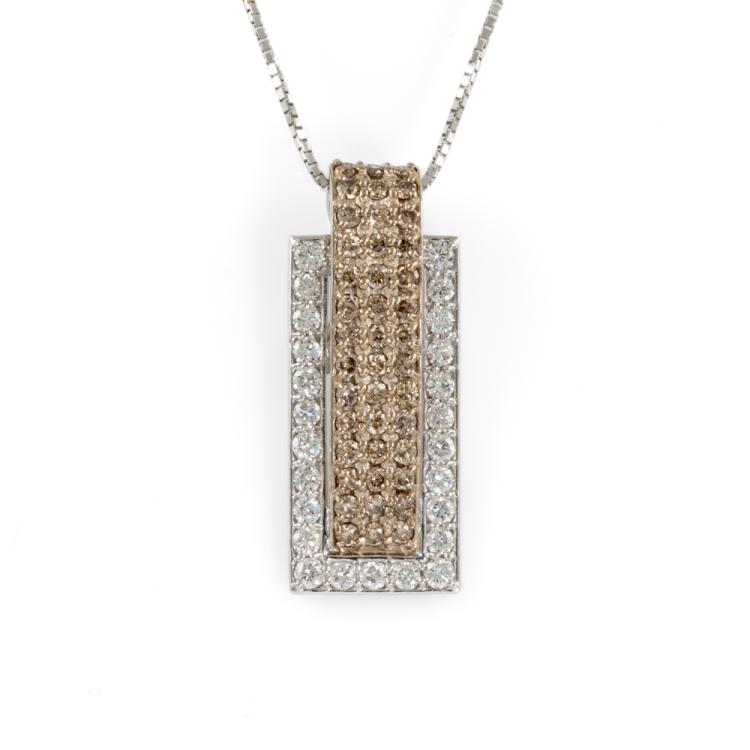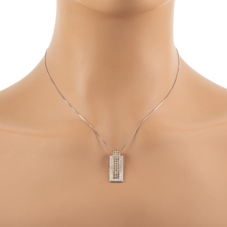 Diamond pendant with Fancy brown & white Natural Diamonds totalling 0.96ct (Estimated grading: Brown SI, G-H SI). 18ct white gold adjustable max length 44.0cm 18ct white gold chain. Weight: 5.8g. (Pre-owned)