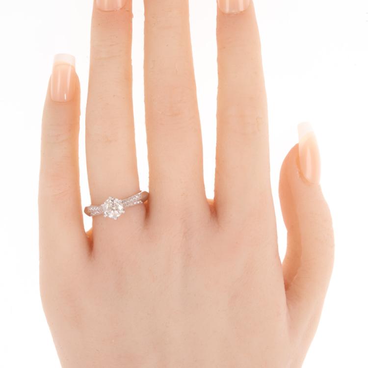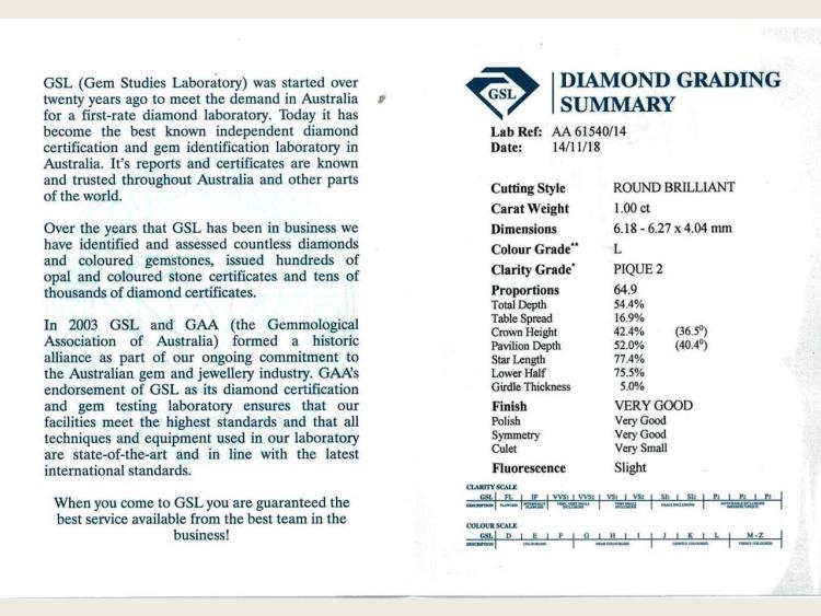 Diamond ring with centre round brilliant cut Natural Diamond of 1.00ct (With GSL summary report graded as L P2 #AA 61540/14) and remaining Diamonds totalling 0.18ct. 18ct white gold. Ring size N. Weight: 3.4g. (New)