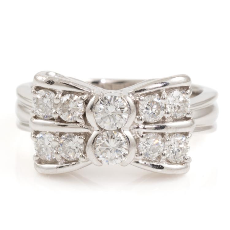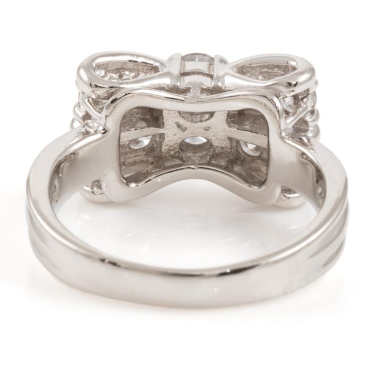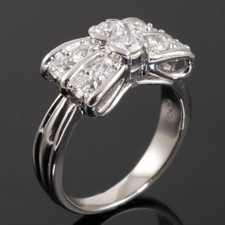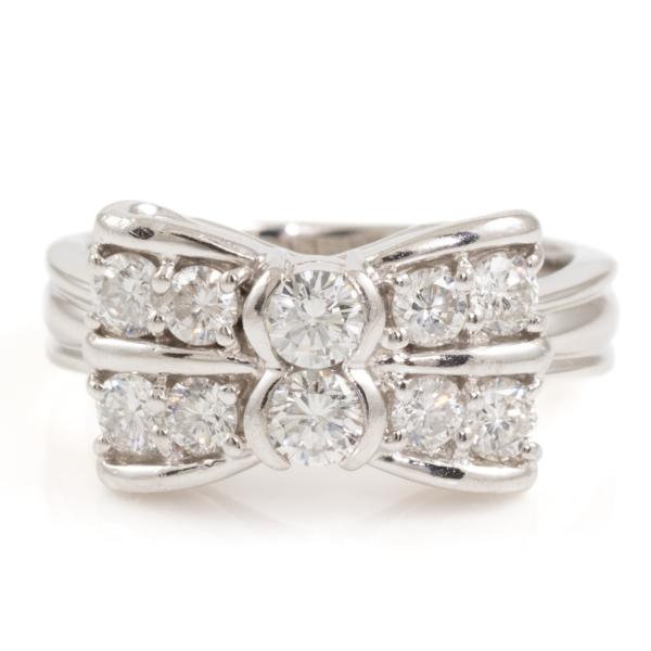 Diamond bow design Dress ring with round Natural Diamonds totalling 1.00ct (Estimated grading: G-H SI). Platinum 900. Ring size M. Band width: 3.70mm - 2.90mm. Weight: 10.4g. (Pre-owned).