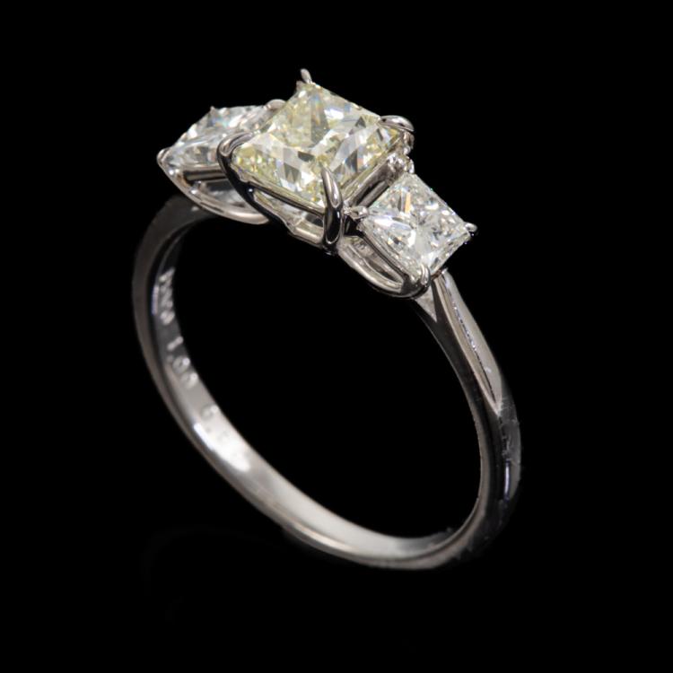 Diamond ring with centre princess cut natural Diamond of 1.00ct (Estimated grading: Fancy Light Yellow VS1) and 2 princess cut natural Diamonds totalling 0.58ct (Estimated grading: G SI). Platinum 900. Ring size K. Band width: 1.6mm - 1.3mm. Weight: 3.2g. With Valuation Certificate #418486 (Pre-owned)