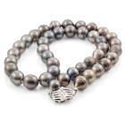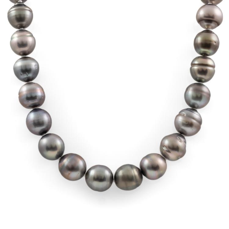 Pearl and Diamond necklace with semi-Baroque & ringed Tahitian Pearls of 10.3 - 10.9mm. 14ct white gold and Platinum 900 clasp set with round Natural Diamonds totalling 0.04ct. Length: 47.0cm. Weight: 68.5g. (Pre-owned)