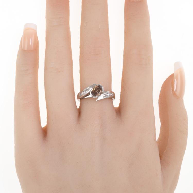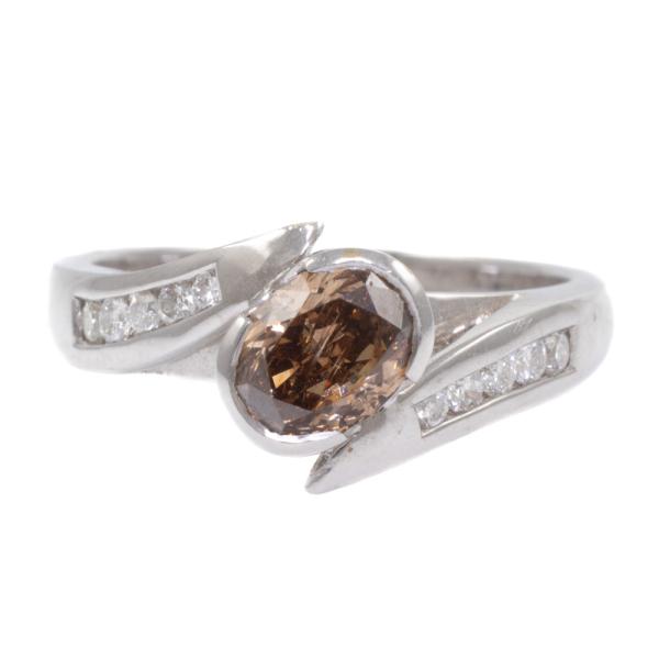 Diamond ring with centre oval shape natural Champagne Diamond of 1.04ct (Estimated grading: Dark Champagne SI2) and round shoulder natural white Diamonds totalling 0.19ct. 18ct white gold. Ring size N. Band width: 2.7mm-3.5mm. Weight: 5.7g. (As new)