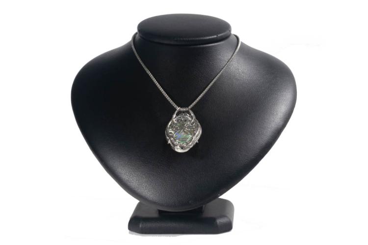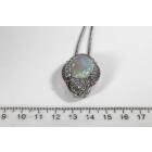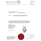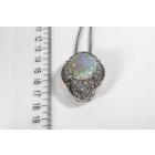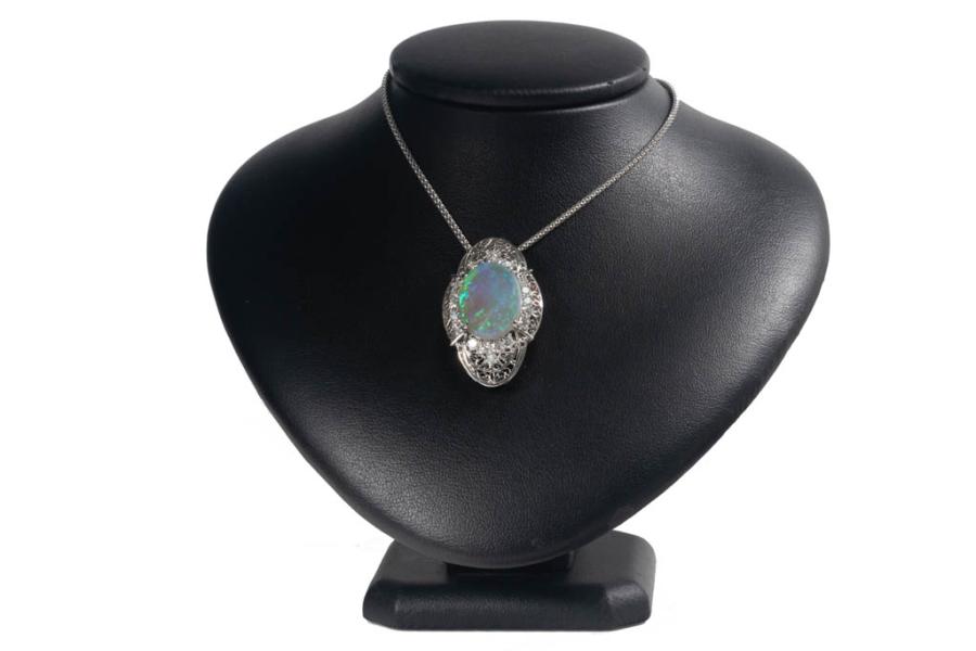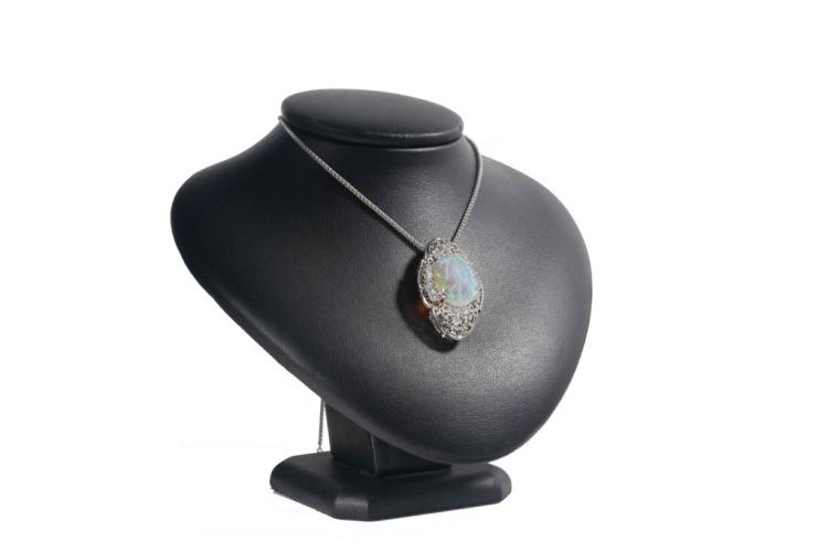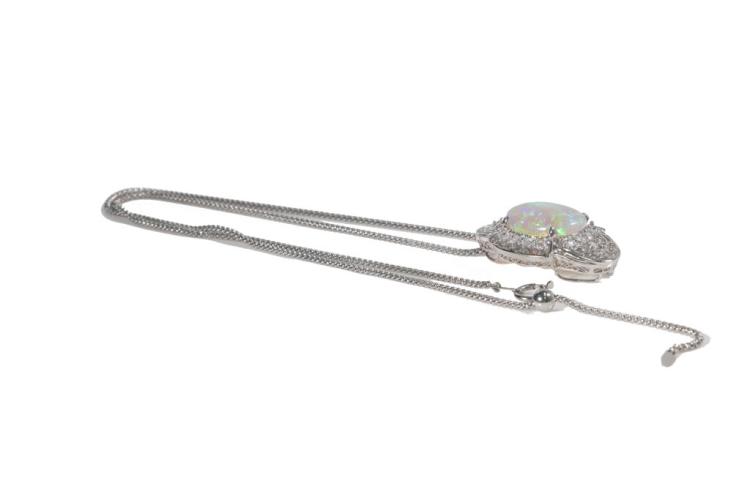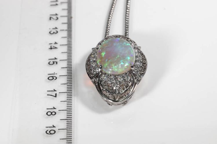 Opal and Diamond pendant with cabochon cut solid natural White Opal of 10.50ct and round natural Diamonds totalling 1.60ct (Estimated grading: G-H SI). Platinum-900 with 55cm platinum-850 chain. Weight: 25.2g. With certificate #416554. (Pre-owned)