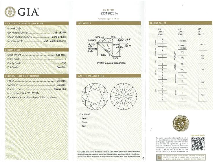 A loose round brilliant cut Natural Diamond of 1.05ct (with GIA report graded as E VS1#223128514