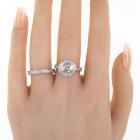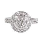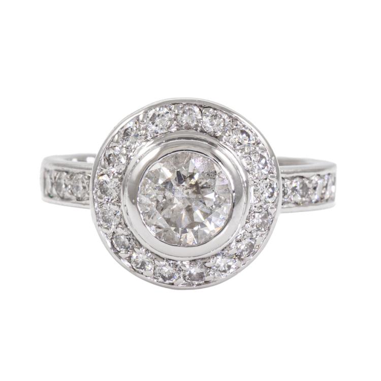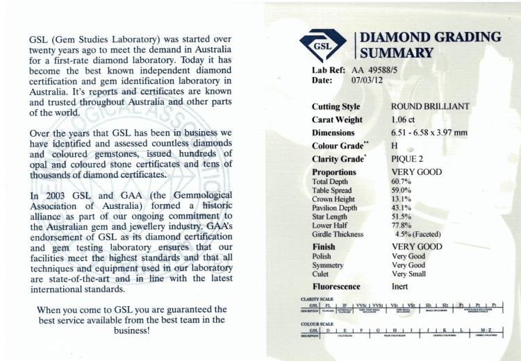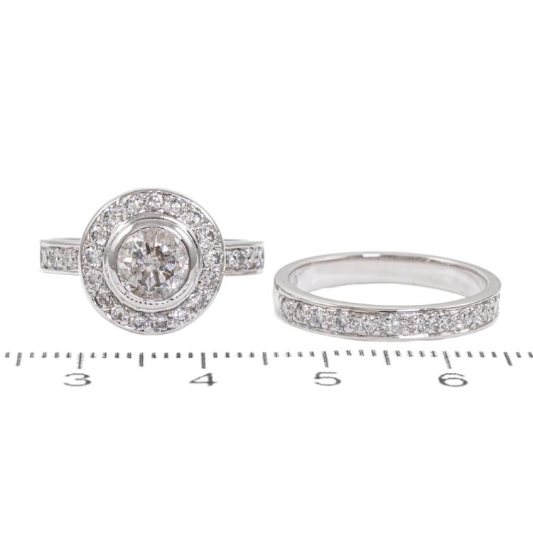 Diamond engagement ring Set. 1) Diamond halo ring with a centre round brilliant cut Natural Diamond of 1.06ct (with GSL Summary Report graded as H P2 #AA 49588/5) and remaining round Natural Diamonds totalling 0.55ct (Valuation Certificate graded as F-G SI). 2) Matching eternity ring with round Natural Diamonds totalling approximately 0.20ct. Both 18ct white gold. Ring size M. Both band width: 2.9mm. Total weight: 11.4g. With copy of Valuation #201112-3. (Pre-owned)