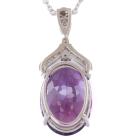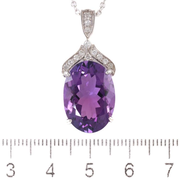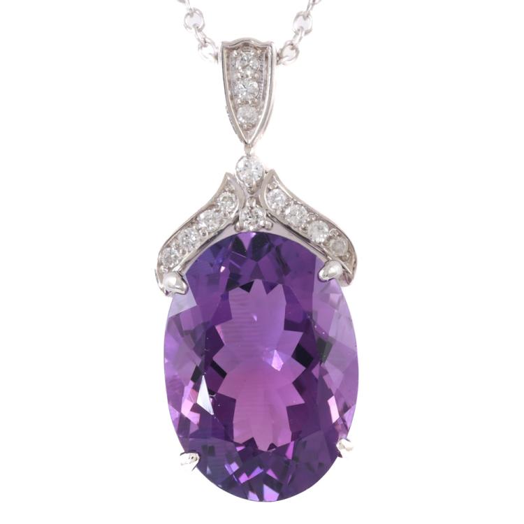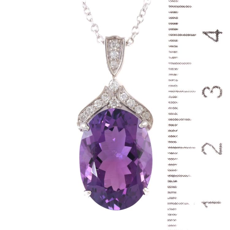 Amethyst and Diamond pendant with oval shape Natural Amethyst of 11.61ct and round Natural Diamonds totalling 0.21ct. 18ct white gold with 18ct white gold 44cm chain. Weight: 8.2g (Pre-owned)