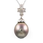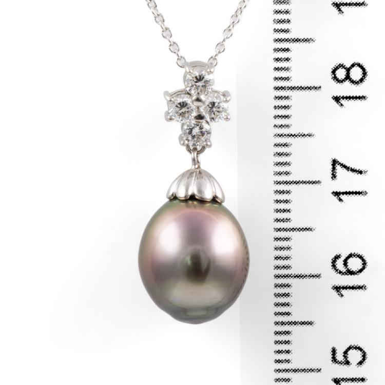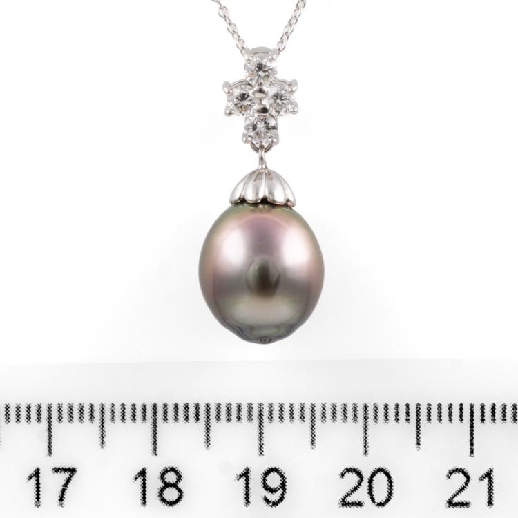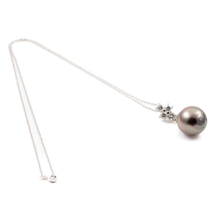 Pearl and Diamond pendant with an oval shape Tahitian Pearl of 11.6mm and Diamonds totalling 0.44ct (Estimated grading: H SI). Platinum 900 with 14ct white gold 40cm chain. Weight: 5.3g. (Pre-owned)