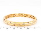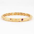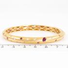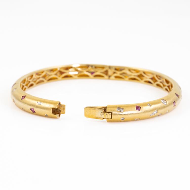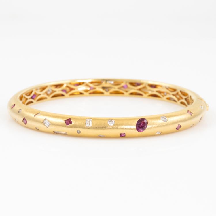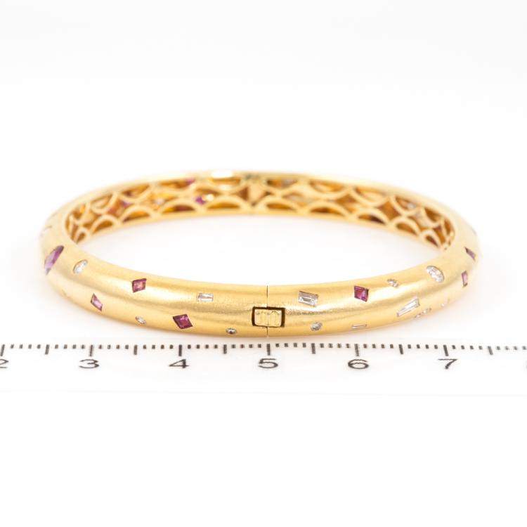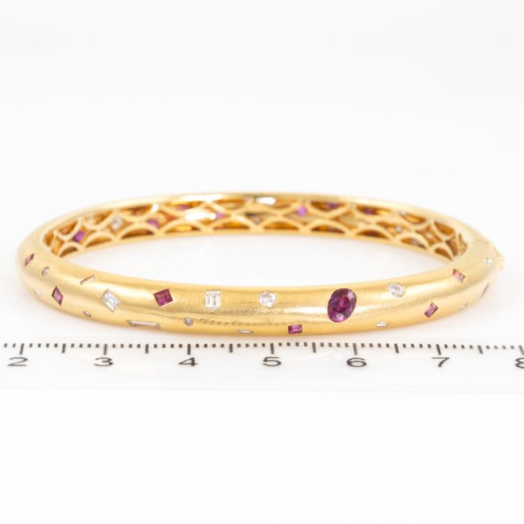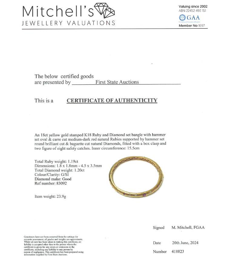 Ruby and Diamond bangle with oval & carre cut natural Rubies totalling 1.19ct and round & baguette cut natural Diamonds totalling 1.20cts (Estimated grading: G SI). 18ct yellow gold. Inner circumference: 15.5cm. Width: 6.1mm. Weight: 23.9g. With Certificate #418823. (Pre-owned)