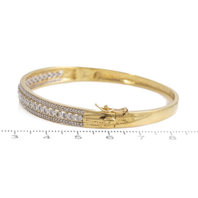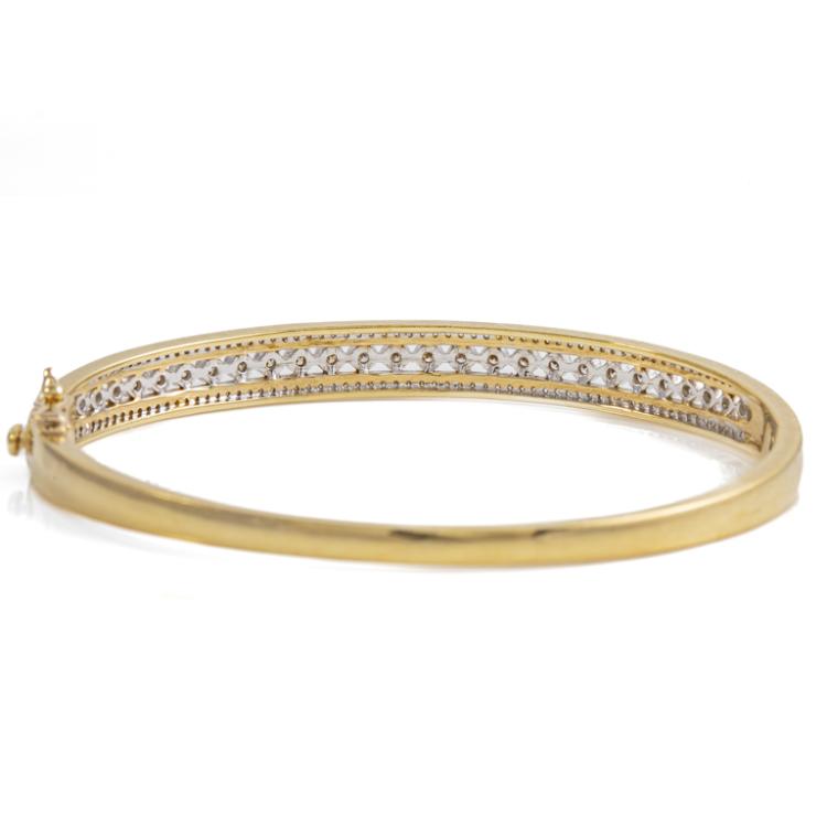 Diamond bangle with round Natural Diamonds totalling approximately 1.20ct (Estimated grading: J-K SI). 9ct yellow and white gold. Circumference: 16.2cm. Width: 3.2mm - 5.0mm. Weight 14.6g. (Pre-owned)