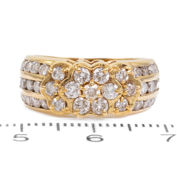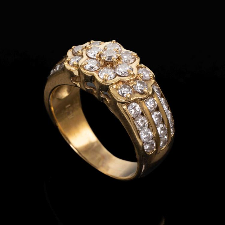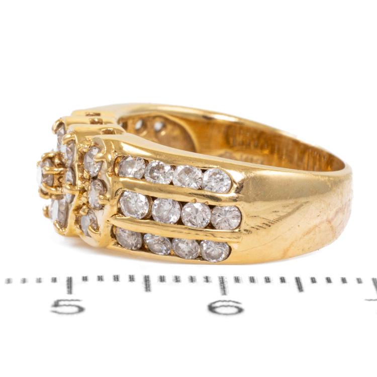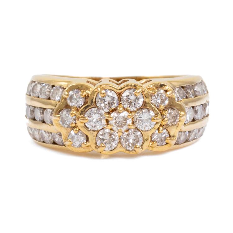 Diamond dress ring with round Natural Diamonds totalling 1.21ct (Estimated grading: I-J SI-P1). 18ct yellow gold. Ring size: J1/2 - Resizing not recommended. Band width: 3.90 - 5.50mm. Weight: 6.9g. (Pre-owned)