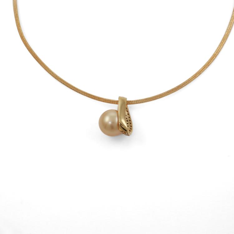 Pearl and Diamond pendant with Golden South Sea Pearl of 12.8mm and round Natural Diamonds totalling 0.60ct (Estimated grading: H-I SI). 18ct yellow gold with 40cm 18ct yellow gold Omega chain. Weight: 13.7g. (Pre-owned)