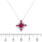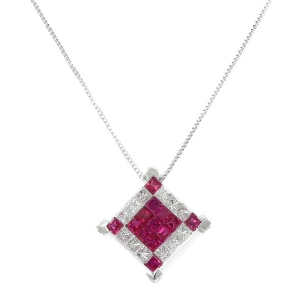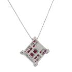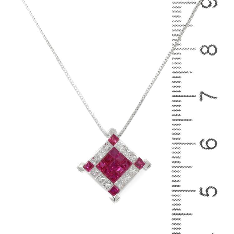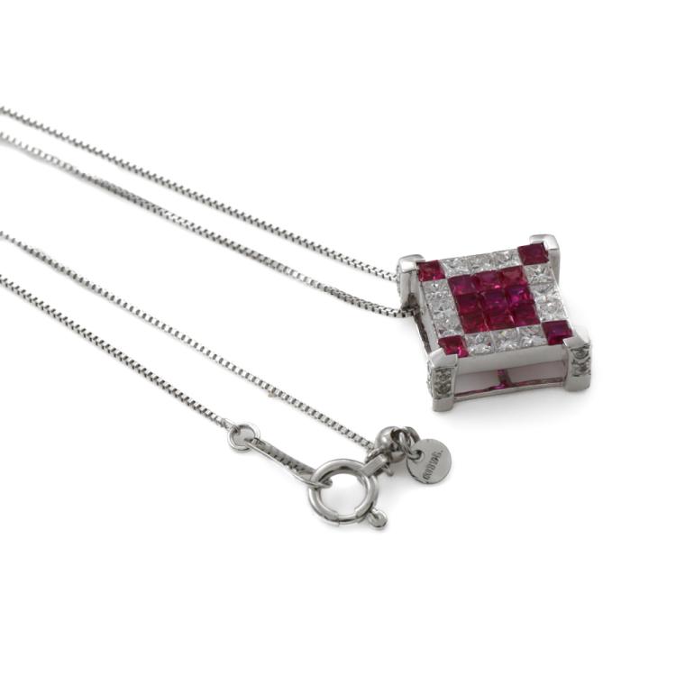 Ruby and Diamond pendant with princess cut Natural Rubies totalling 1.30ct and round & princess cut Natural Diamonds totalling 0.67ct (Estimated grading: G-I VS-SI). 18ct white gold with 18ct white gold adjustable 45cm chain. Weight: 3.4g. (Pre-owned)