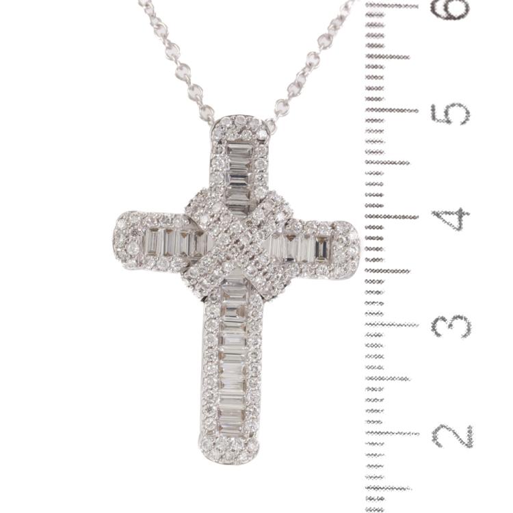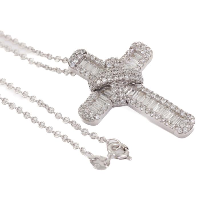Diamond cross pendant with round & baguette cut Natural Diamonds totalling 1.33ct (Estimated grading: G-H VS-SI). 18ct white gold with 18ct white gold 45cm chain. Weight: 7.8g. (Pre-owned)