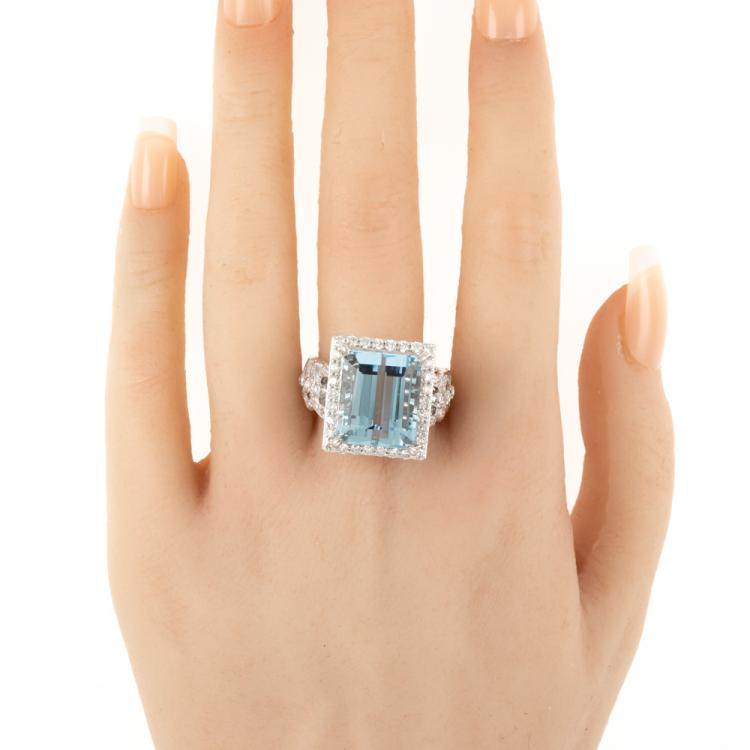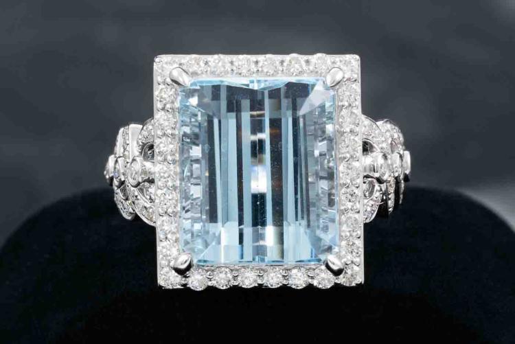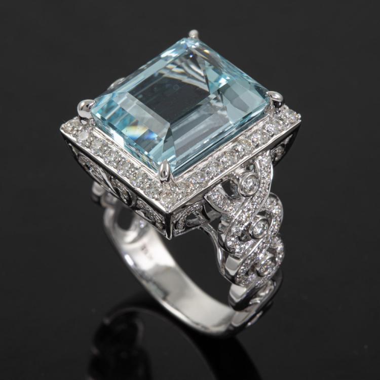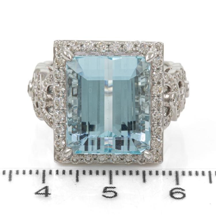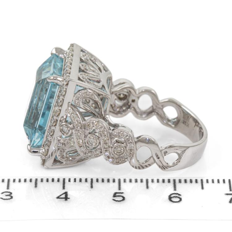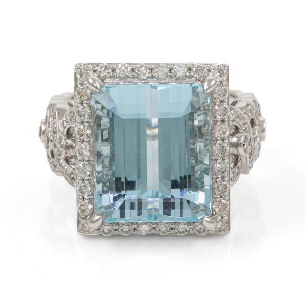 Aquamarine and Diamond ring with an emerald cut natural Aquamarine of 13.50ct and round natural Diamonds totalling 1.47ct (Estimated grading: I-J SI). 18ct white gold. Ring size T. Band width: 4.4mm - 5.5mm. Weight: 15.3g. With Certificate #418658. (Pre-owned)