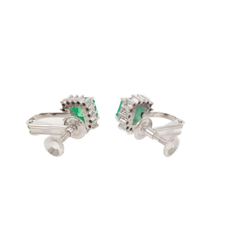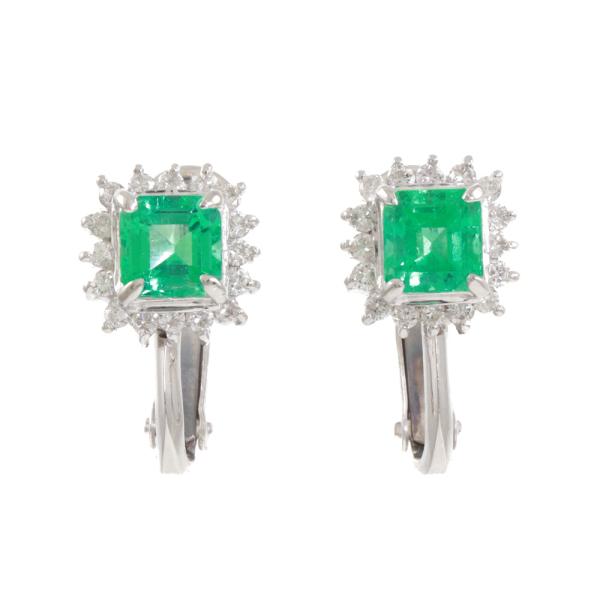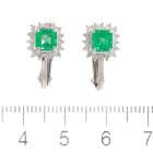 Emerald and Diamond clip-on earrings (for non-pierced ears) with square emerald cut Natural Emeralds totalling 1.40ct and round Natural Diamonds totalling 0.39ct (Estimated grading: H-I SI). 14ct white gold with silicon caps. Weight: 6.2g. (Pre-owned)