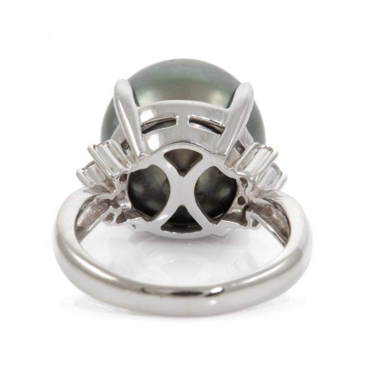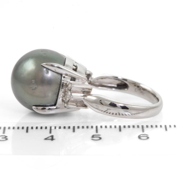 Pearl and Diamond ring with Tahitian Pearl of 14.2mm and round Natural Diamonds totalling 0.16ct. Platinum 900. Ring size N. Band width: 2.7mm - 3.9mm. Weight: 13.1g. (Pre-owned)