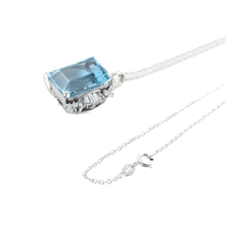 Aquamarine and Diamond pendant with emerald cut natural Aquamarine of 14.33ct and round & baguette cut natural Diamonds totalling 0.75ct (Estimated grading: G-H VS-SI). Platinum - 900 with 45cm 18ct white gold chain. Weight: 13.7g. With Certificate #419189. (Pre-owned)