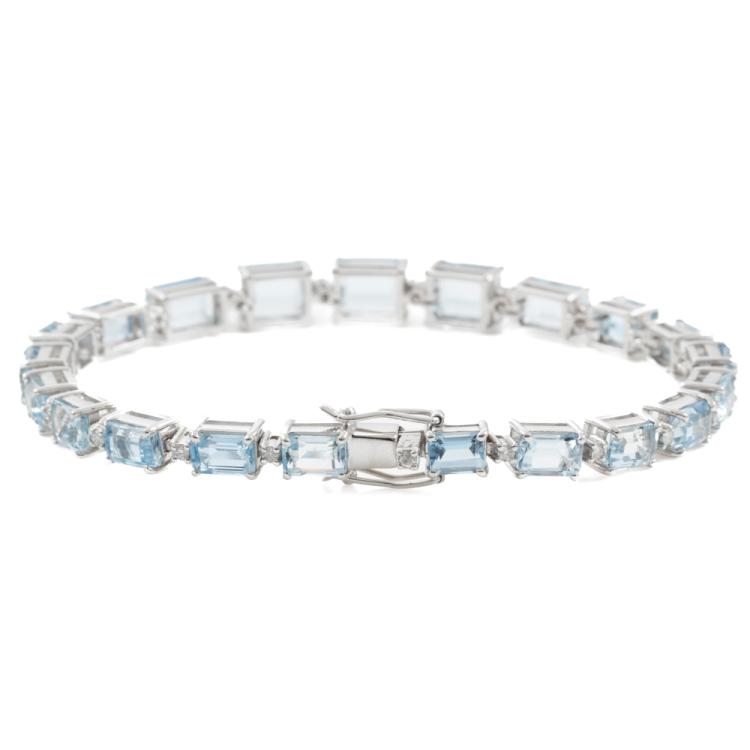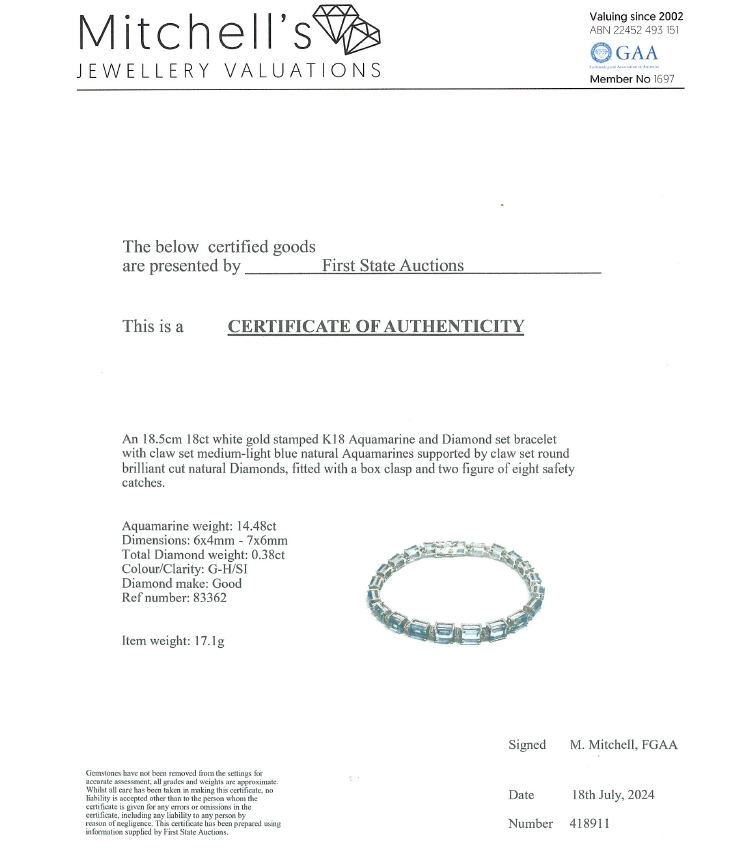 Aquamarine and Diamond bracelet with emerald cut natural Aquamarines totalling 14.48ct and round natural Diamonds totalling 0.38ct (Estimated grading: G-H SI). 18ct white gold. Length: 18.5cm. Weight: 17.1g. With Certificate #418911. (Pre-owned)