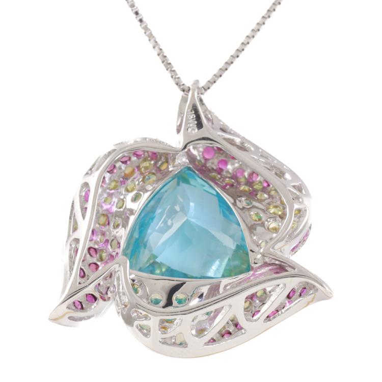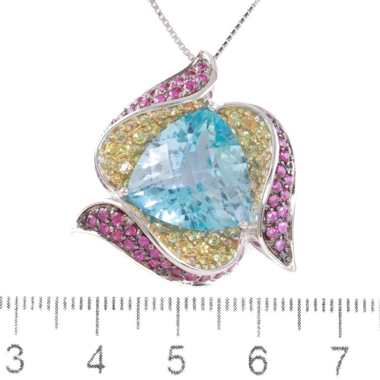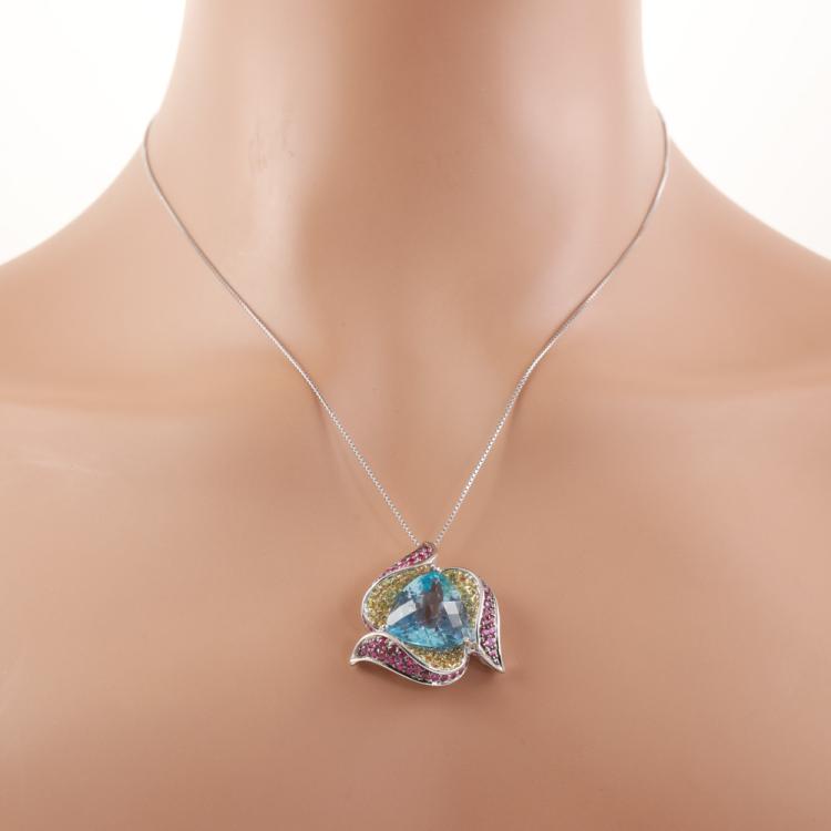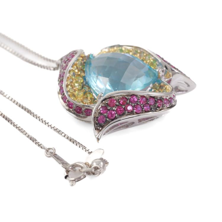 Topaz and Diamond pendant with trilliant cut blue Natural Topaz of 14.68ct and round Natural Rubies & Natural yellow Sapphires totalling 2.33ct. 18ct white gold with adjustable 45cm 18ct white gold chain. Weight: 13.8g. (Pre-owned)