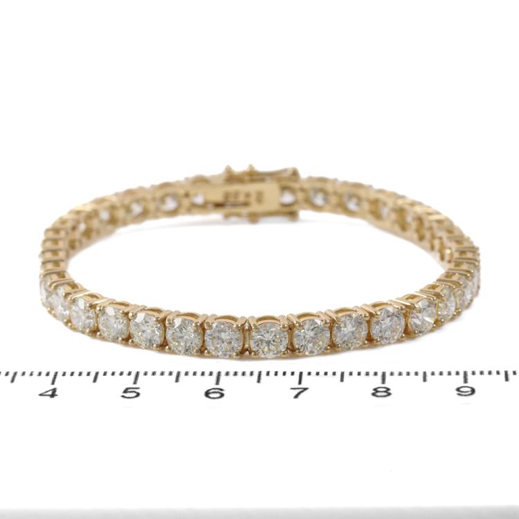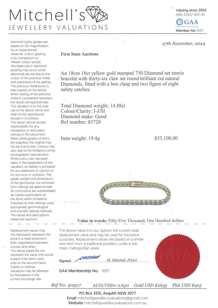 Diamond tennis bracelet with 36 round Natural Diamonds totalling 14.88ct (Estimated grading: I-J SI). 18ct yellow gold. Length: 18cm. Weight: 19.4g. With Valuation Certificate #419517. (New)